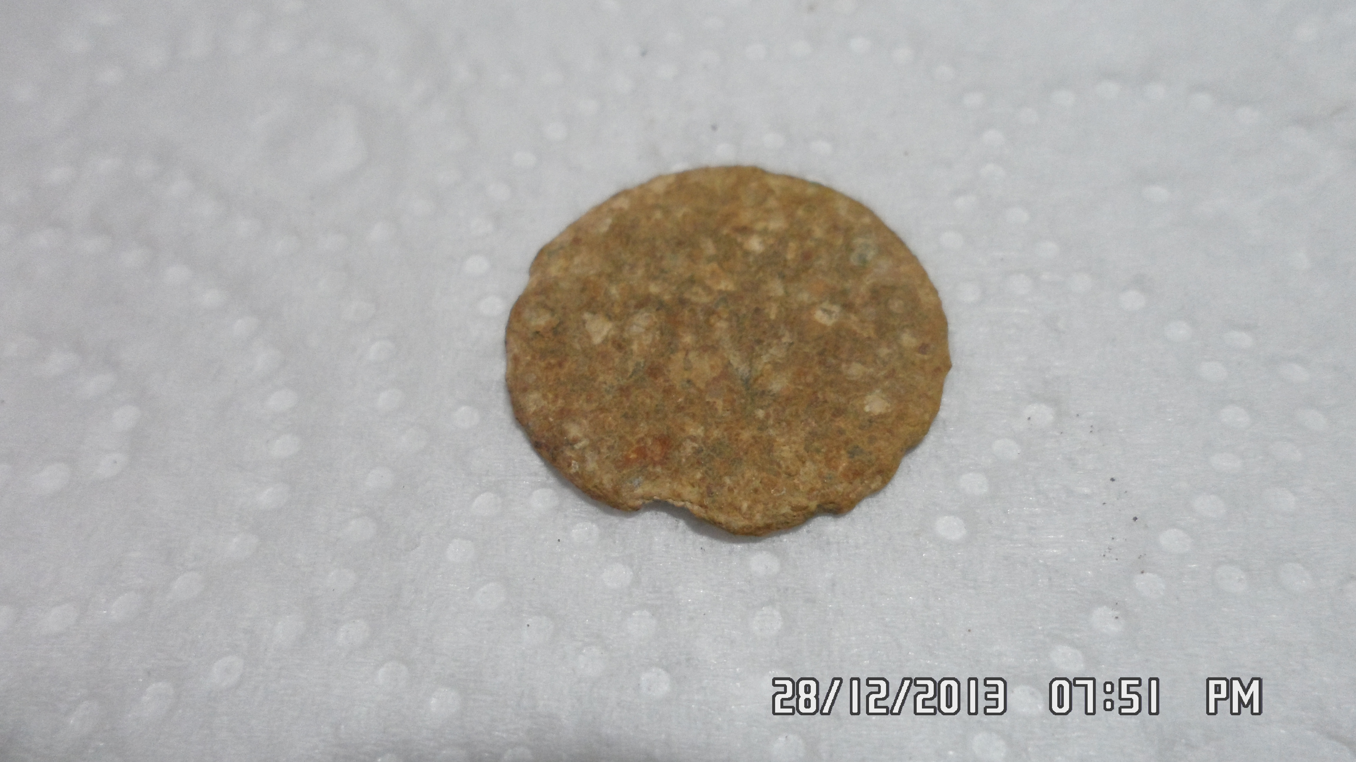 Die Münze konnte ich noch nicht bestimmen. Dem Gewicht nach ist es kein Alu. Ich kann bis jetzt keinerlei Zahlen oder Buchstaben erkennen.