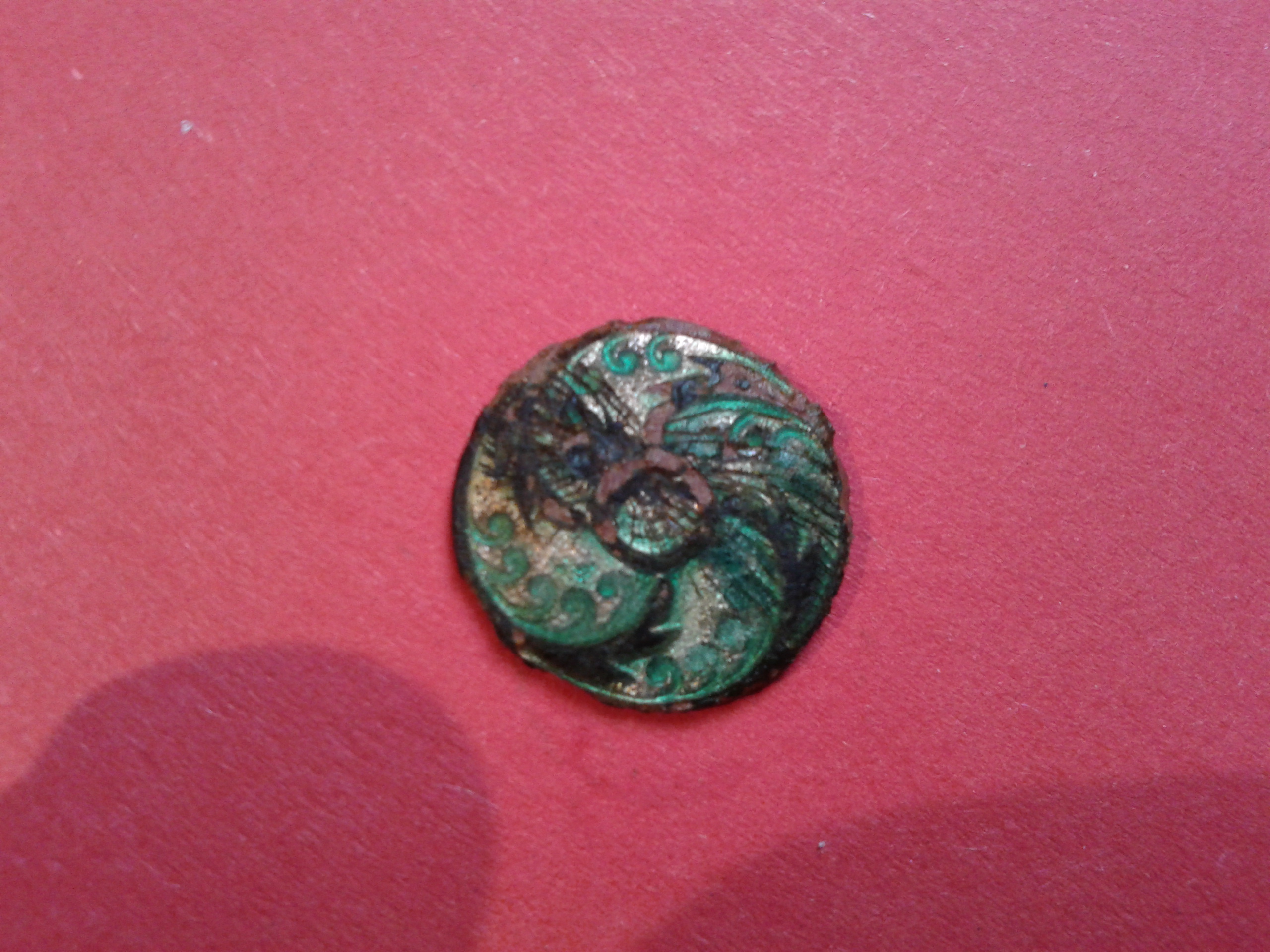 Bild 2: Knopf vergoldet 15 mm Durchmesser,die Ornamente in grün