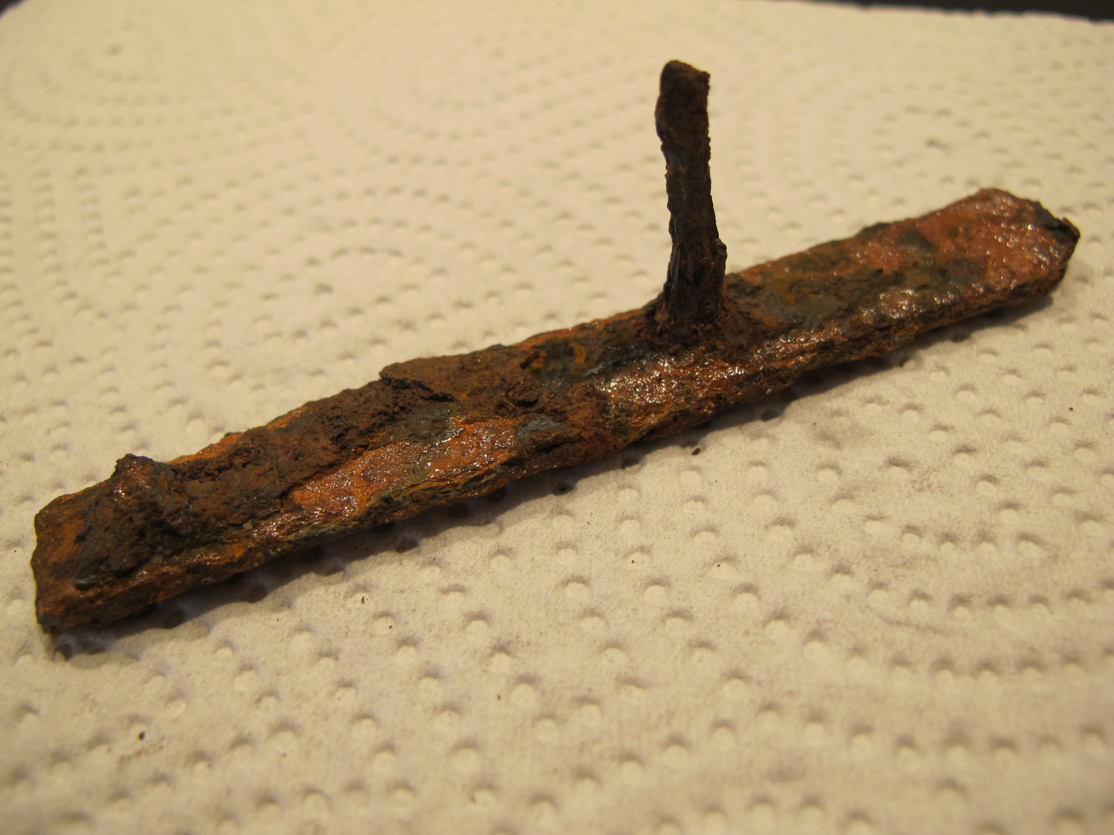 ich habe diese Dinge auf einem Ackerstück gefunden......die Dinger unterscheiden sich sehr von den üblichen Drahtresten, Krampen und Bolzen, die ich sonst so finde. Besonders dieses längliche Ding mit der Spitze hat mich doch sehr überrascht. Es war zu einem länglichen braunen Klumpen korrodiert. Von der Form her hatte ich es zunächst als moderne Schraube mit unten sitzender Mutter abgetan. Ich war dann doch sehr erstaunt, was nach Natronbad und Elektrolyse zum Vorschein kam. Auch die anderen Dinge finde ich ich bemerkenswert. So etwas habe ich noch vorher noch nicht gesehen und glaube auch nicht, dass die von einem Traktor oder Pferdewagen stammen, oder ? Da ich noch keine Erfahrung habe, bitte ich um Mithilfe bei der Einordnung..auch wäre es nett, wenn jemand etwas zum ungefähren alter der Stücke sagen könnte !