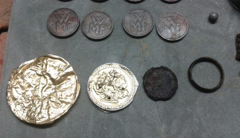 Hallo. .heute waren wir wieder mal zusammen sondeln...die suche war am Hang bei einer alten Burg. .nichts auser viel Müll..u erst dachte ich Gold bis auf die Funde viele komische Münzen WMF die Firma kenne ich Gruß matt. Schön wars heute manni