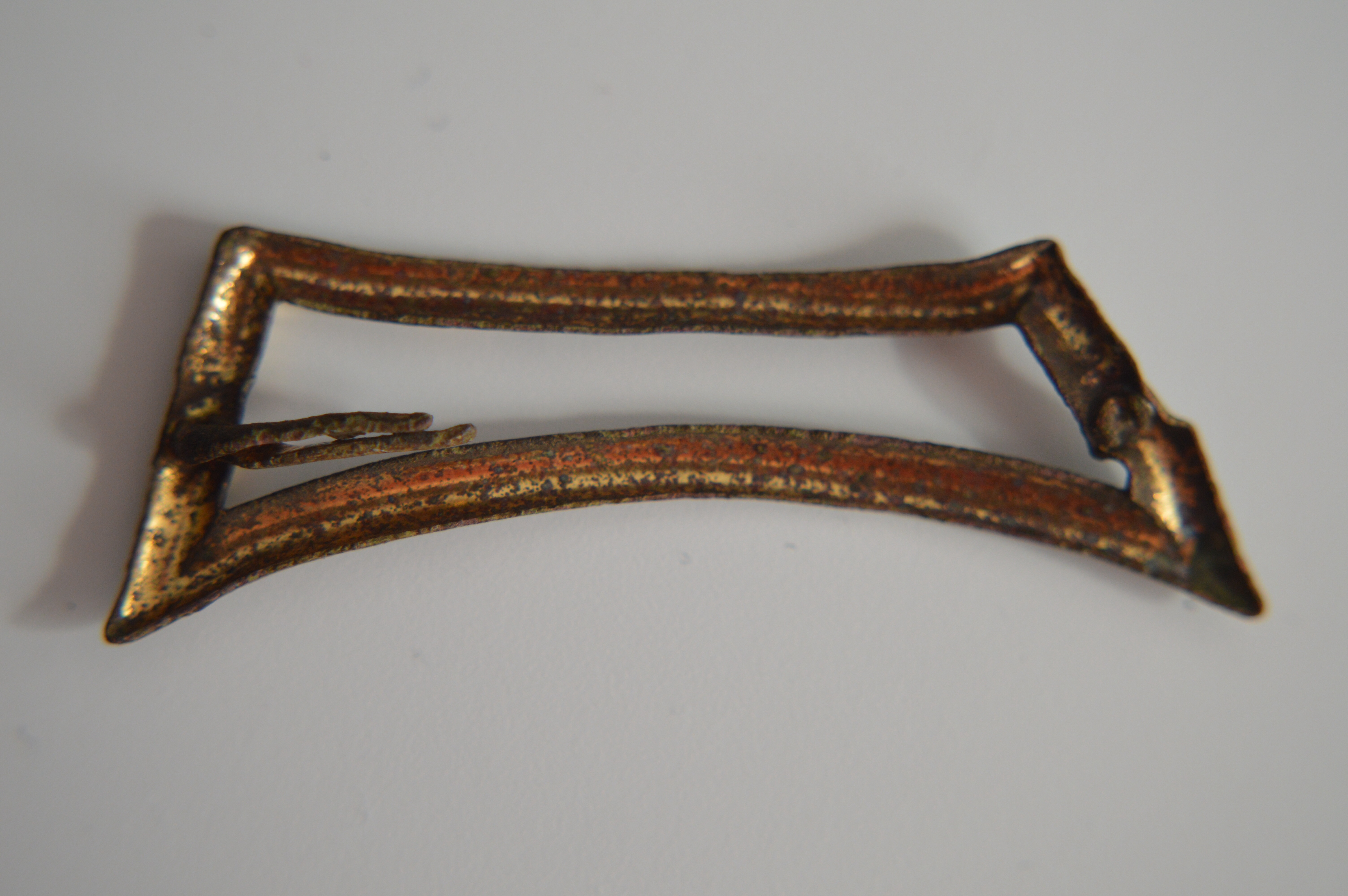 Sieht für mich aus wie ne Gürtelschnalle aus Messing. Ist wohl nur etwas zerdrückt. Mfg