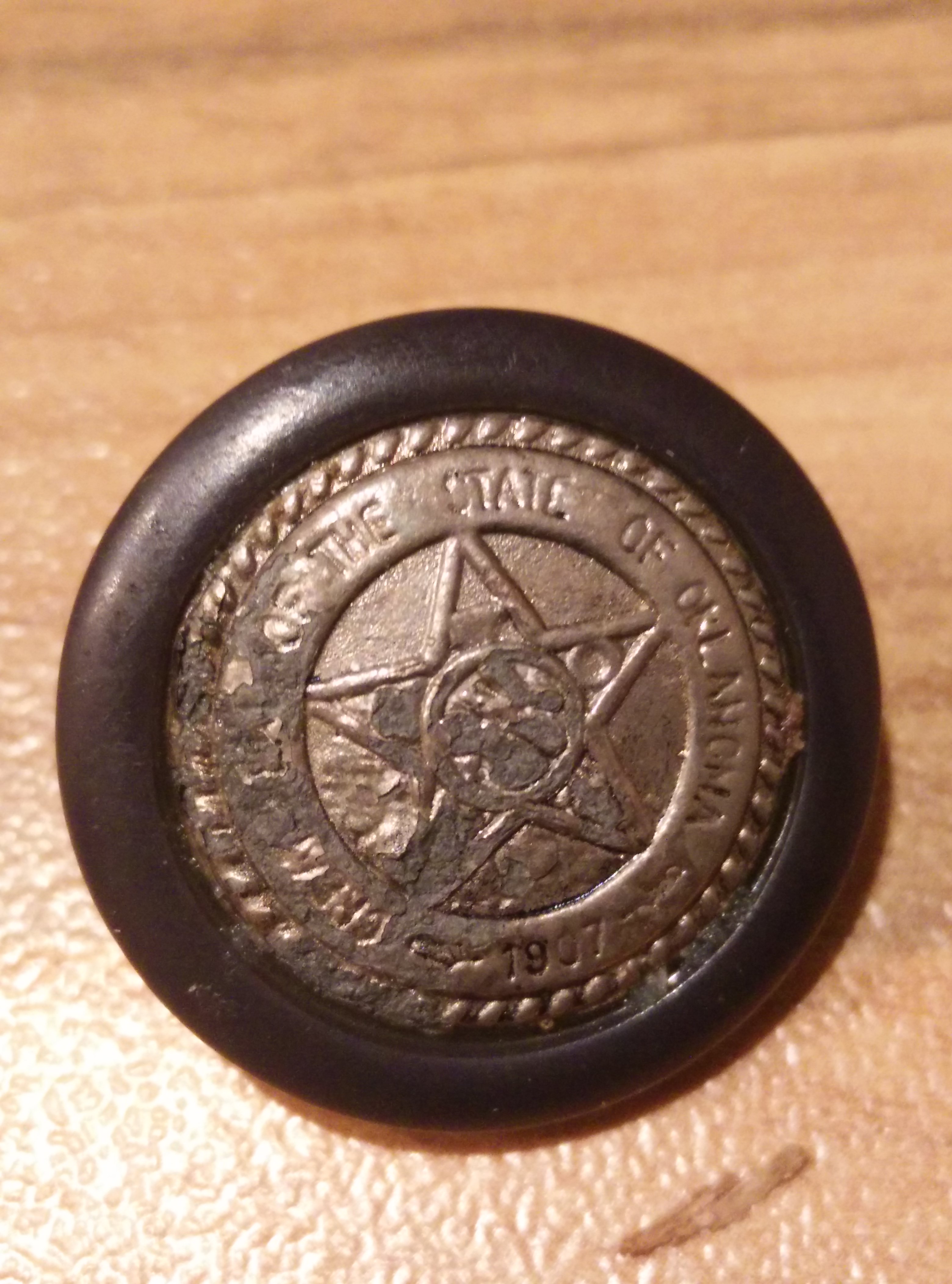 Heute gefunden Knopf mit der Aufschrift State of Oklahoma 1907. Der Knopf ist meiner Meinung nach aus Silber mit einer Kunststoff Einfassung. Denkt ihr er ist original oder aus dem Modehaus.??