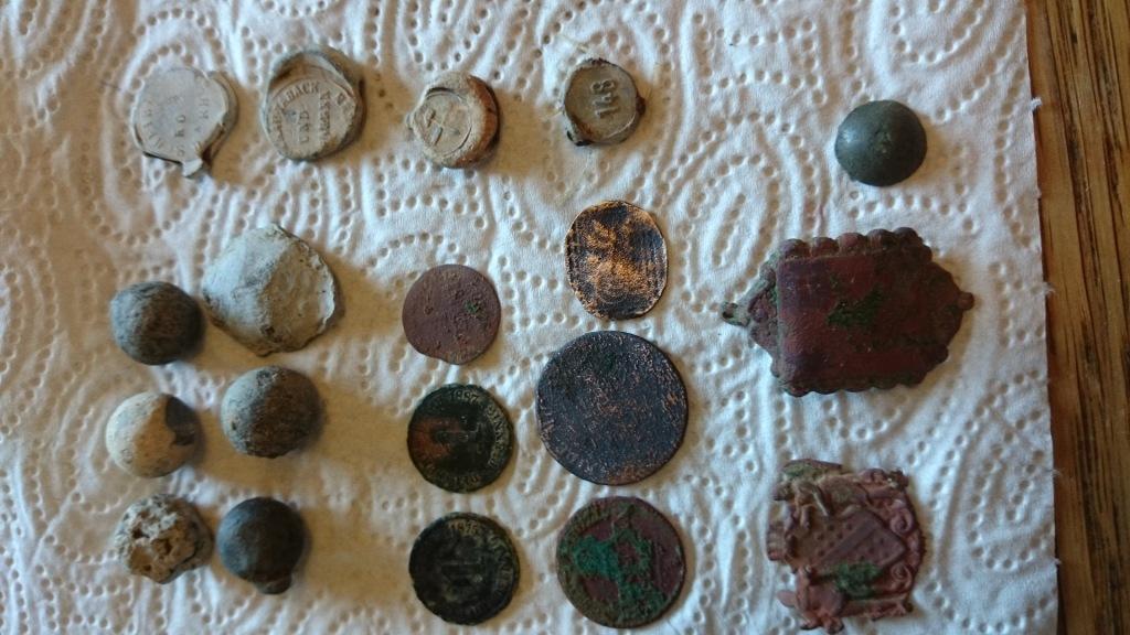War am Samstag mal 2,5 Std unterwegs. Schöne Sachen dabei. 6 Mukus, 4 Plomben , 2 Zierteile eins davon mit Wappen und zwei Engeln, 2mal 1 Reichspfennig,