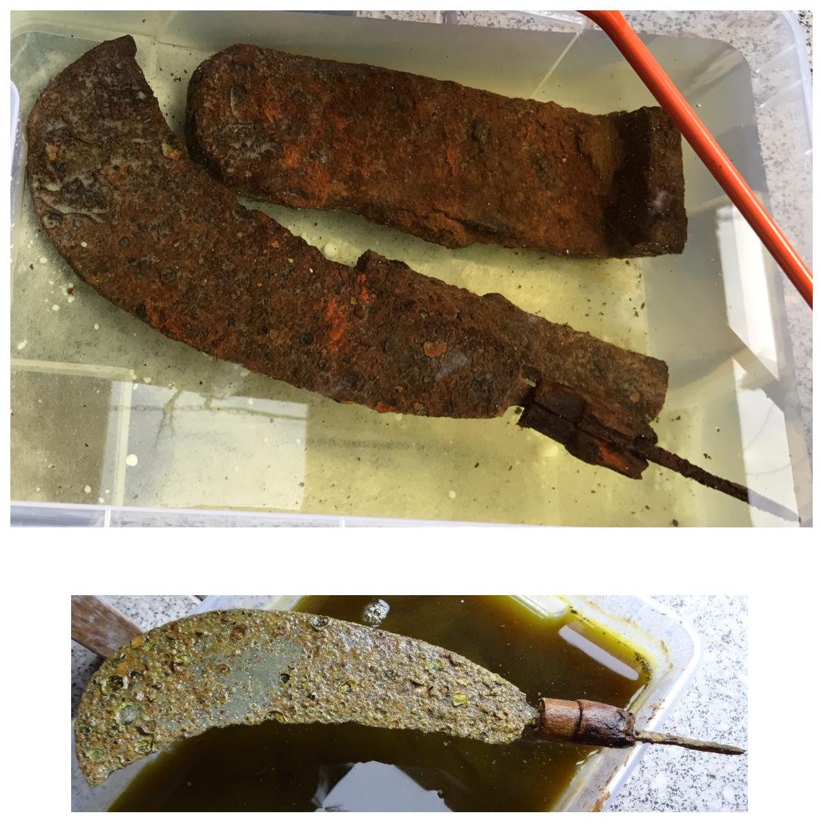 - Fund 1: Ich vermute eine Hippe. Ca. 40 cm lang, 8 cm breit an breitester Stelle. Werkzeug oder als Waffe im Bauernkrieg? 200 bis 500 Jahre alt?