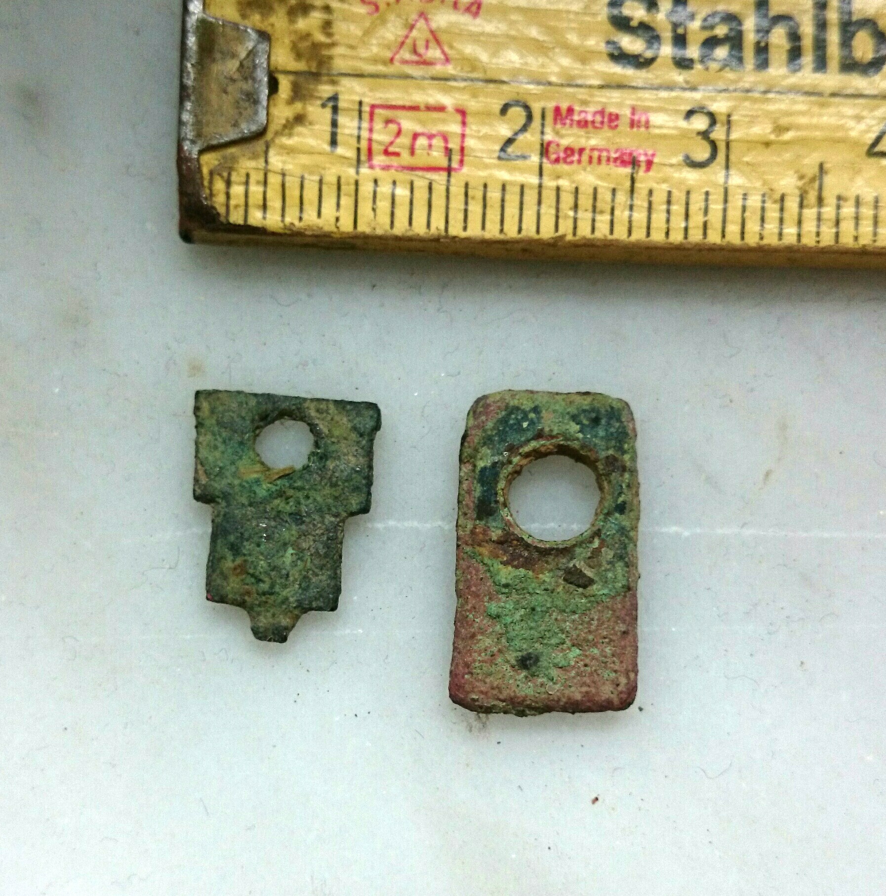 Beim ersten Bild hab ich auch keine Ahnung, Die Splitter auf dem 2.Bild sind echt schön verziert und haben ne hammer Patina! Vielleicht gehörten sie ja mal zu einem kleinen Bronzekessel/gefäß.Denk auch dass die schon sehr alt sind.Beim letzten habe ich zuerst an ein Gewicht gedacht...als Geschoss scheint mir die Form etwas Plump