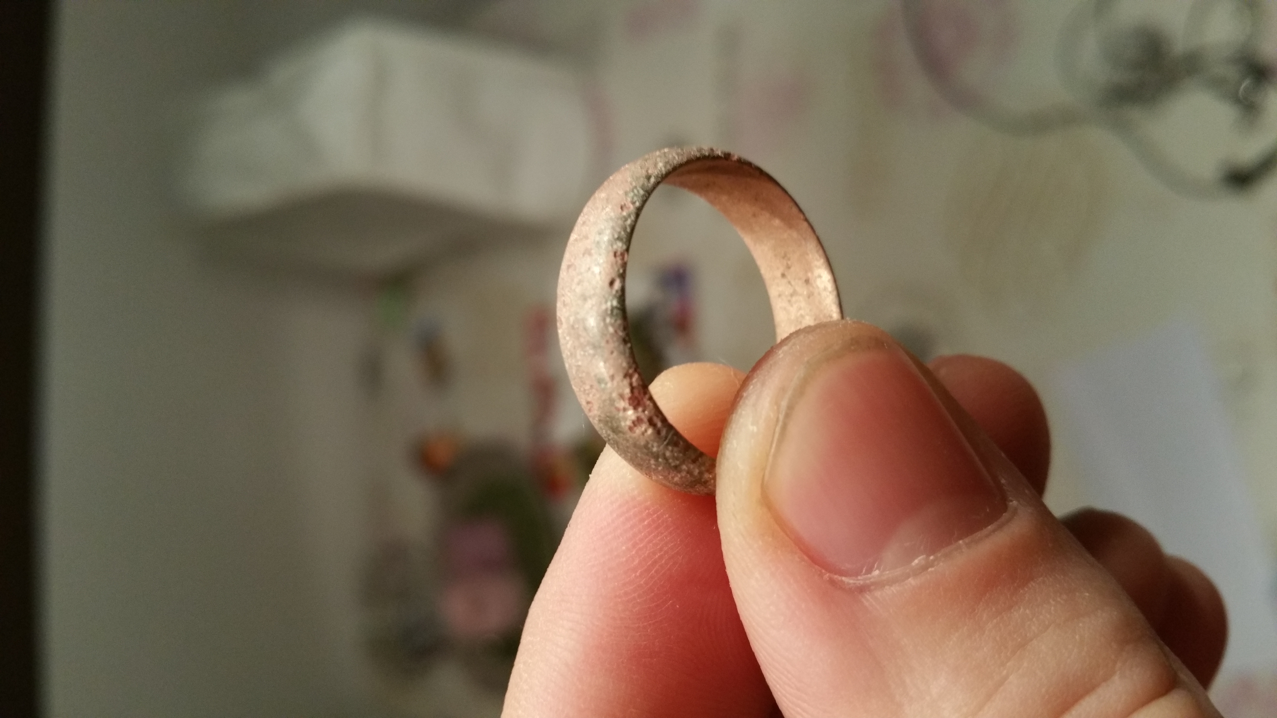 Den Ring habe ich unter einem einzelnen großen und alten Baum auf einer Elbwiese finden können. Er lag ca. 20 bis 25 cm tief. Ich habe ihn für ein paar Stunden in Zitronensaft gelegt und sieht nun wie auf dem Foto aus. Wenn man den Ring etwas längere Zeit zwischen den Fingern hält, oder gar reibt, läuft er an diesen Stellen dunkel an. Gravur oder ähnliches ist nicht vorhanden.