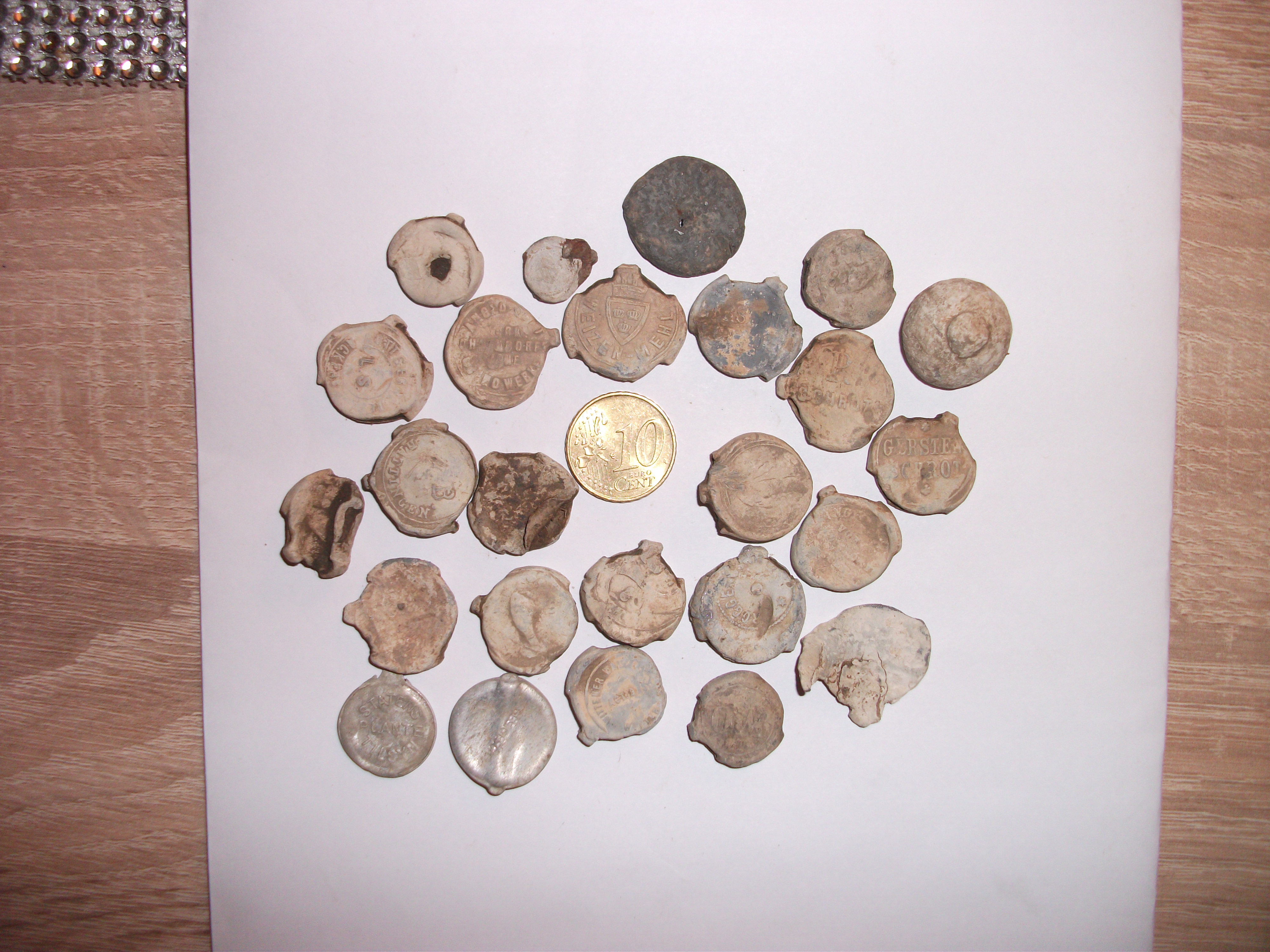 Das Teil ganz oben in der Mitte könnte auch eine "durchgefaulte" Münze sein. Das Gewicht ist aus meiner Sicht zu schwer für eine Plombe. Dazu müsste man es mal in die Hand nehmen.