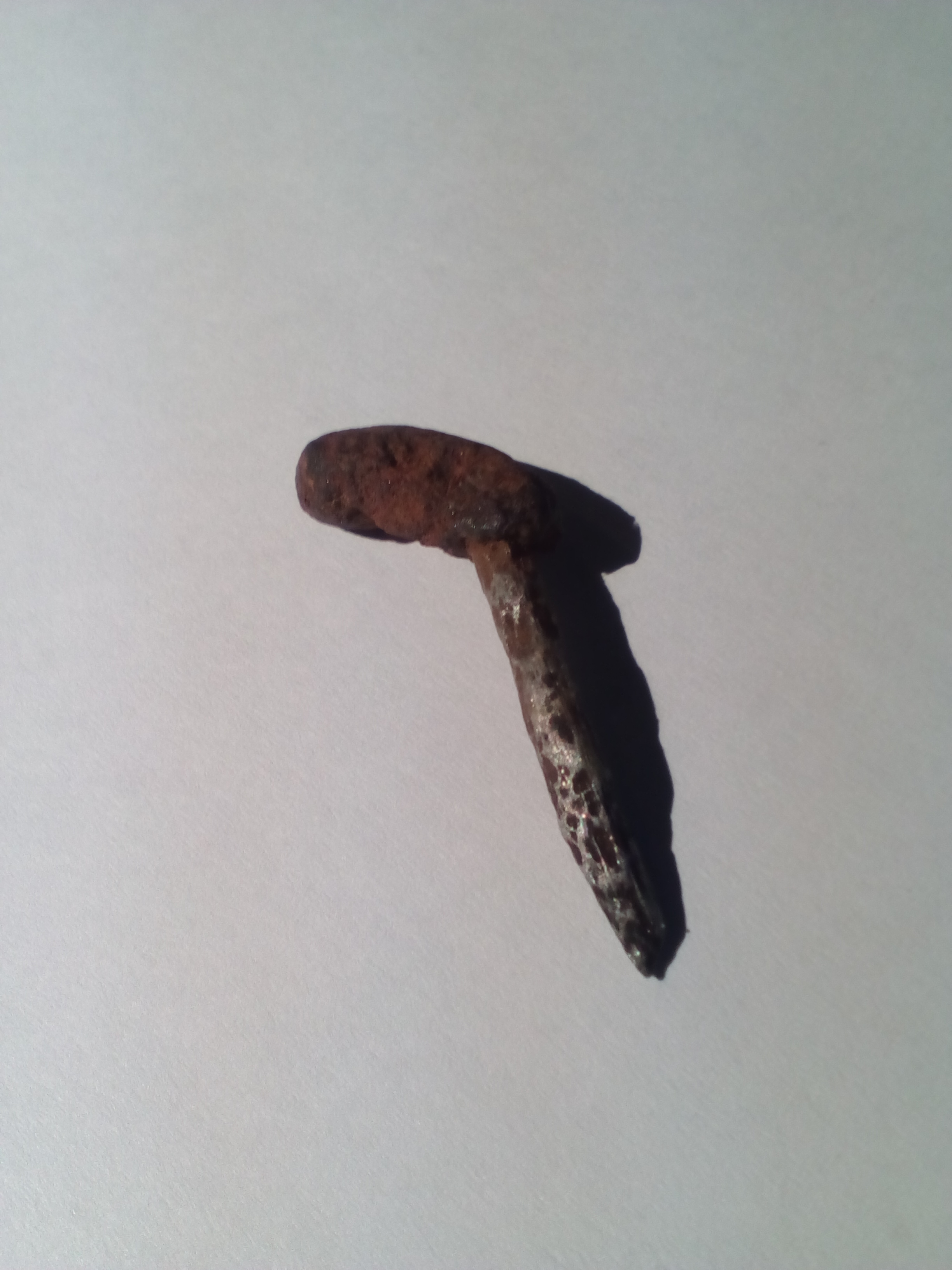 Das Fundstück ist wie gesagt 30 cm tief im Boden gelegen, dort unten war schon gelber Sand, vorher sehr viele Wurzeln. Es muss also schon sehr lange dort gelegen haben. Der Stift ist merkwürdig in seiner Oberfläche, wie Hammerschlag, er ist auch leicht magnetisch, aber nicht verrostet, der Schmutz lies sich mit dem Fingernagel abkratzen, am Ende sehr spitz, nicht biegbar. Die "Bohne" am Ende ist nicht magnetisch aber verkrustet. Bin mir nicht sicher, ob das alles Verkrustung ist oder ob das zu dem Gesamtkunstwerk gehört.
