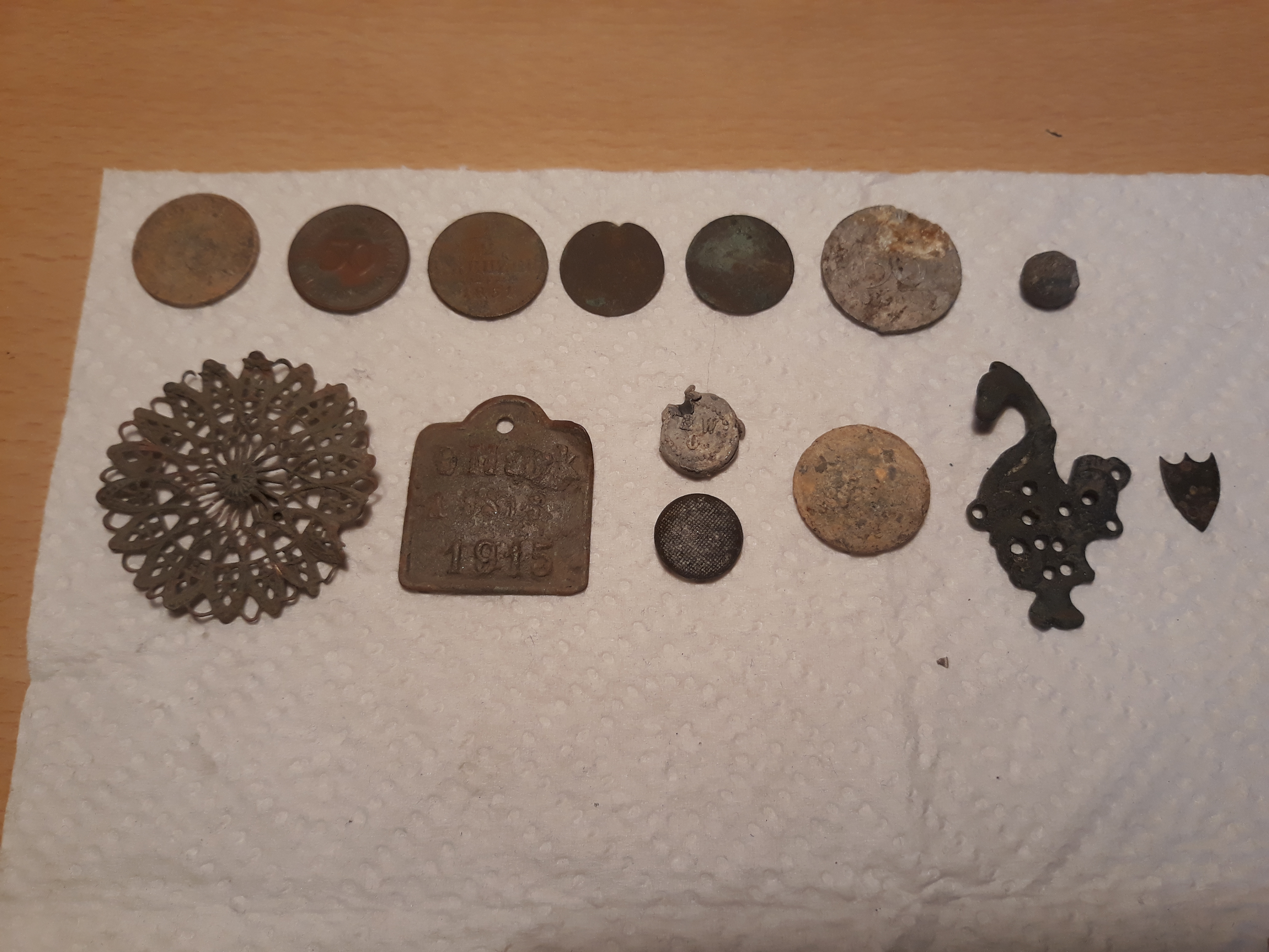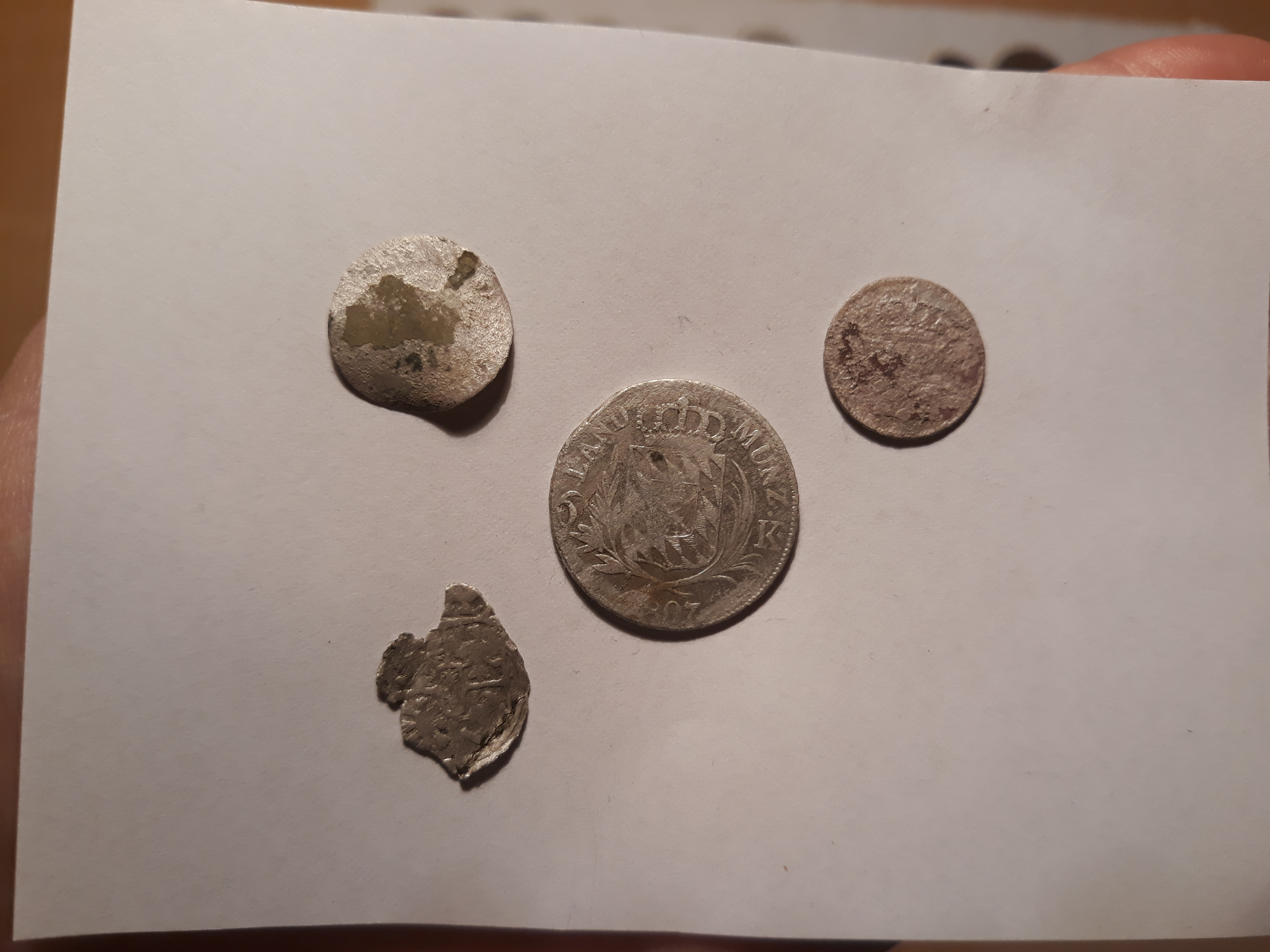 3 Silbermünzen, Miederhaken, Knöpfe usw