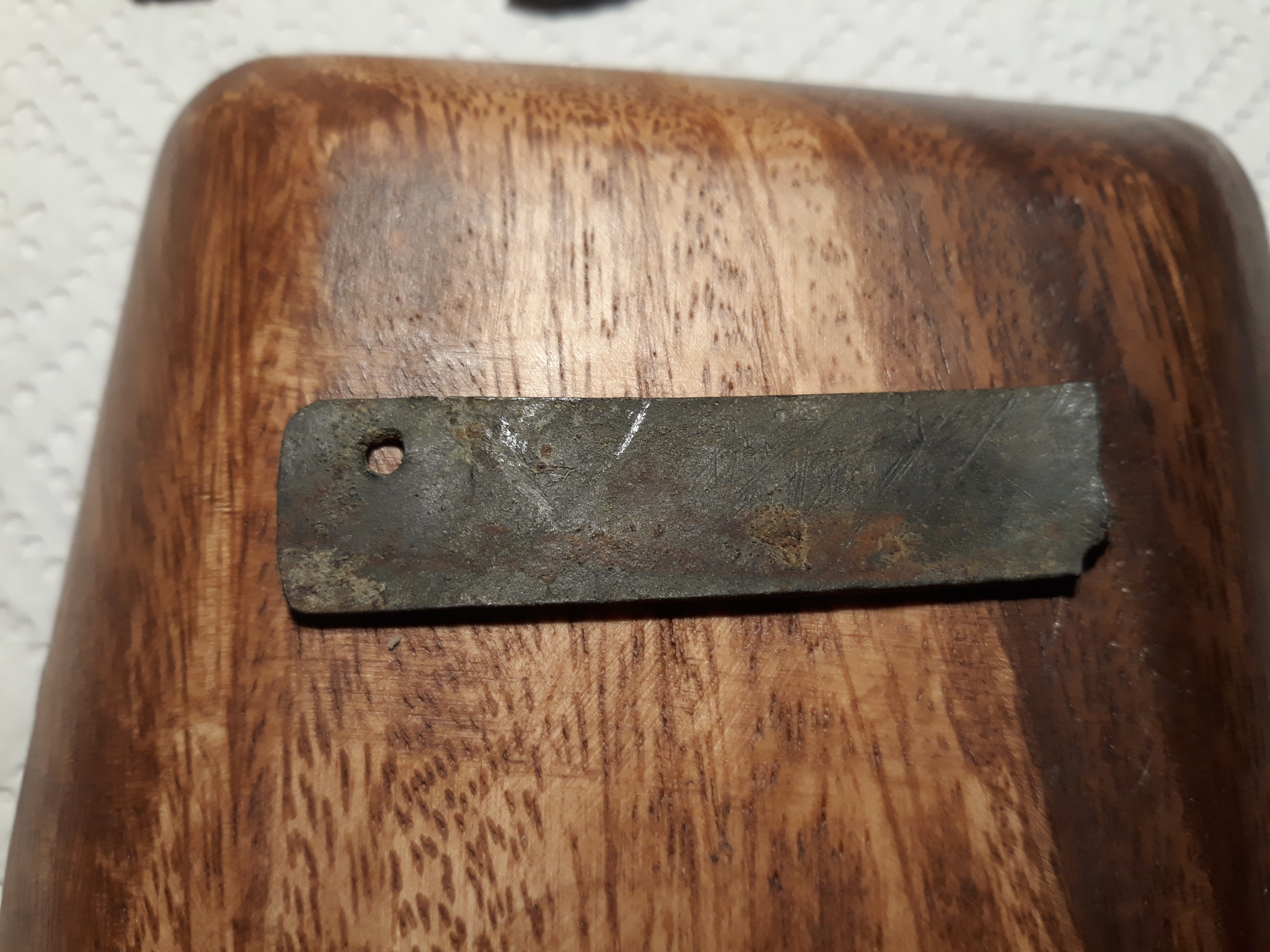 denke das wird eine Einlage für einen Messergriff gewesen sein. Jagdszene darauf zu sehen? Jemand eine Ahnung wie alt in etwa? Länge ca 8 cm , Breite 2 cm.