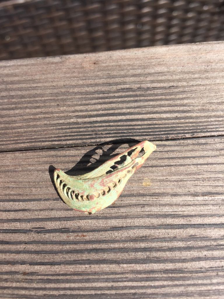 Hey ihr, hier noch mal das gute Stück, habe es vorsichtig in den Ursprung zurück gebogen, bin mir jetzt auch ziemlich sicher daß es sich um Kupfer mit einem teils abgeblatzen Goldüberzug handelt. Von der Öse zu Urteilen eine Kette, das Symbol sagt mir nichts, vl. Federn oder Flügel?! Fakt ist es lässt mir keine Ruhe ich habe nun schon Stunden mit der Recherche verbracht und nichts brauchbares gefunden.