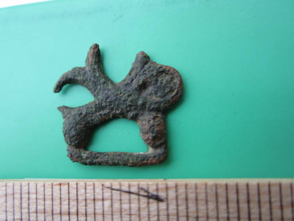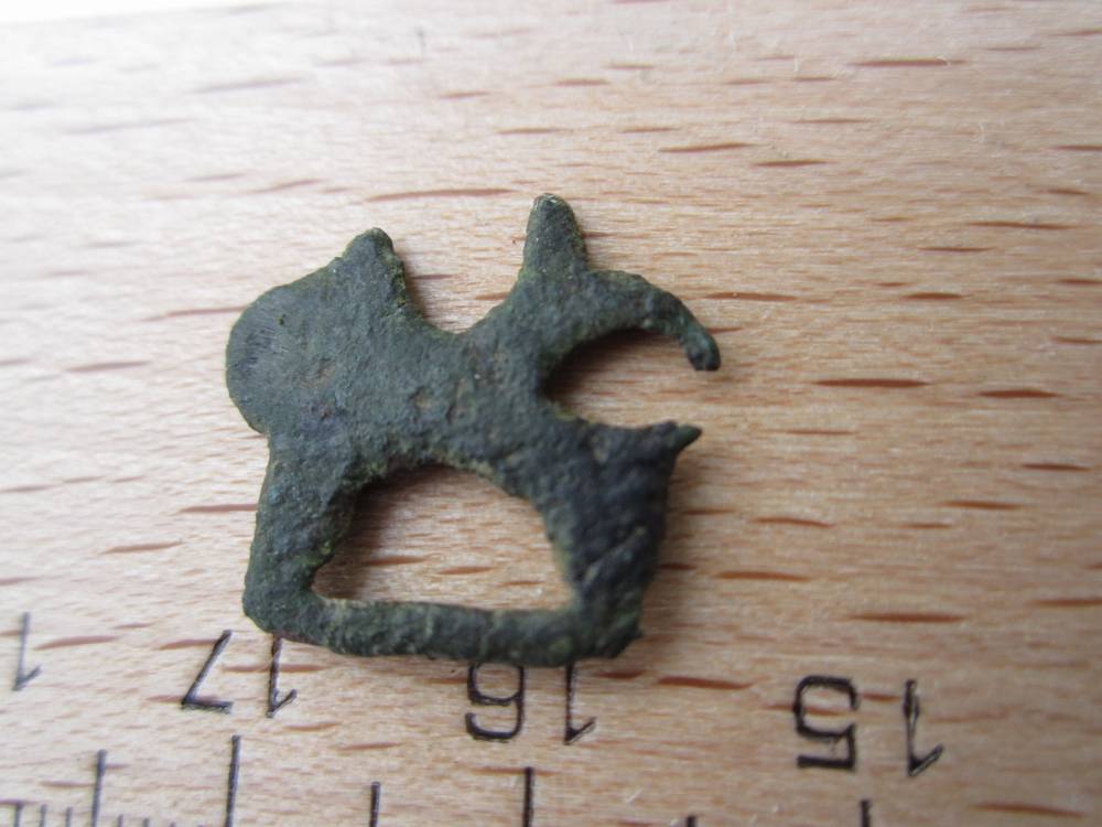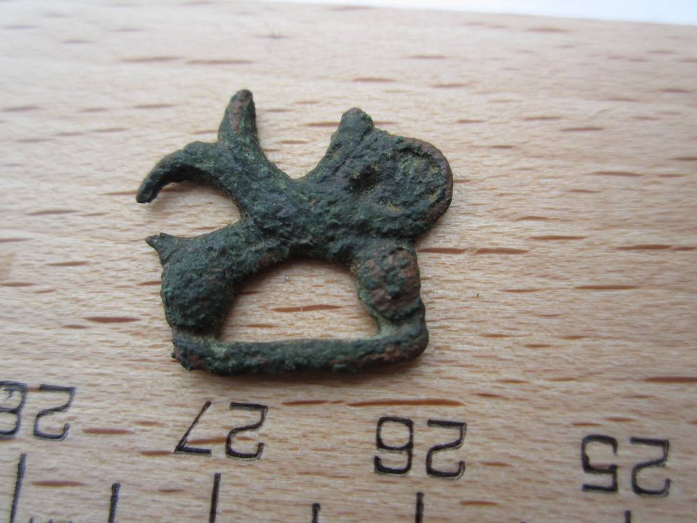 Ich bin ziemlich ratlos, was Form und Funktion dieses Stückes betrifft, eine Befestigungsmöglichkeit ist nämlich nicht zu erkennen. Der untere Teil sieht aus wie eine sehr kleine Schnalle, darüber ist aber etwas tierähnliches zu erkennen, Anklänge an einen Löwen ? Diesem würde aber ein Gebilde wie ein Fischschwanz aus dem Rücken wachsen. also das ist völlig verrückt.