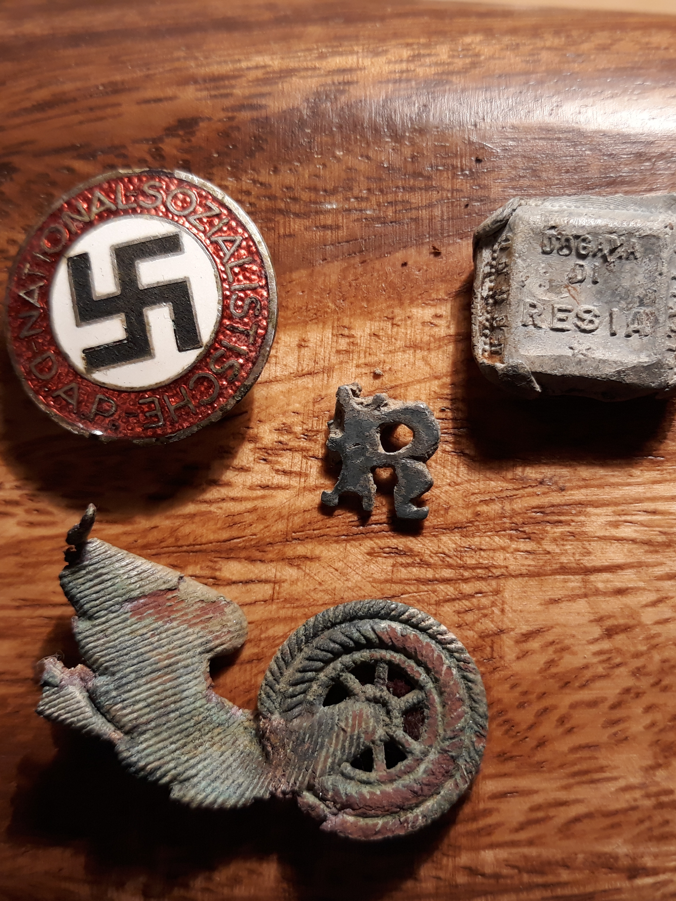 Es hat einen Durchmesser von etwa 8 cm. Material dürfte Bronze sein. Nadel ist weggerostet. Verzierung nur konzentrische Rillen nach innen verjüngend. Eine größere außen und ein kl Loch in der Mitte.