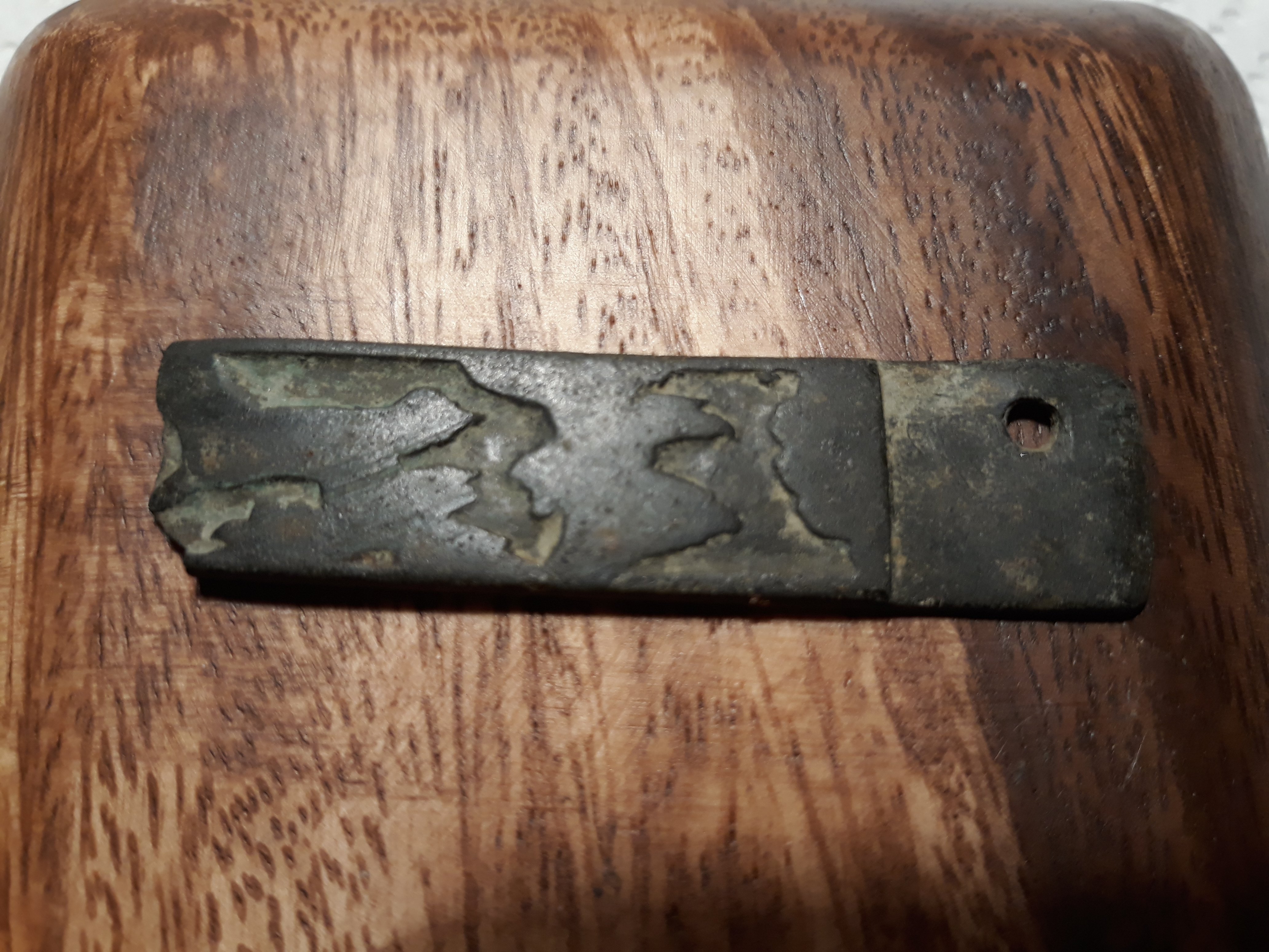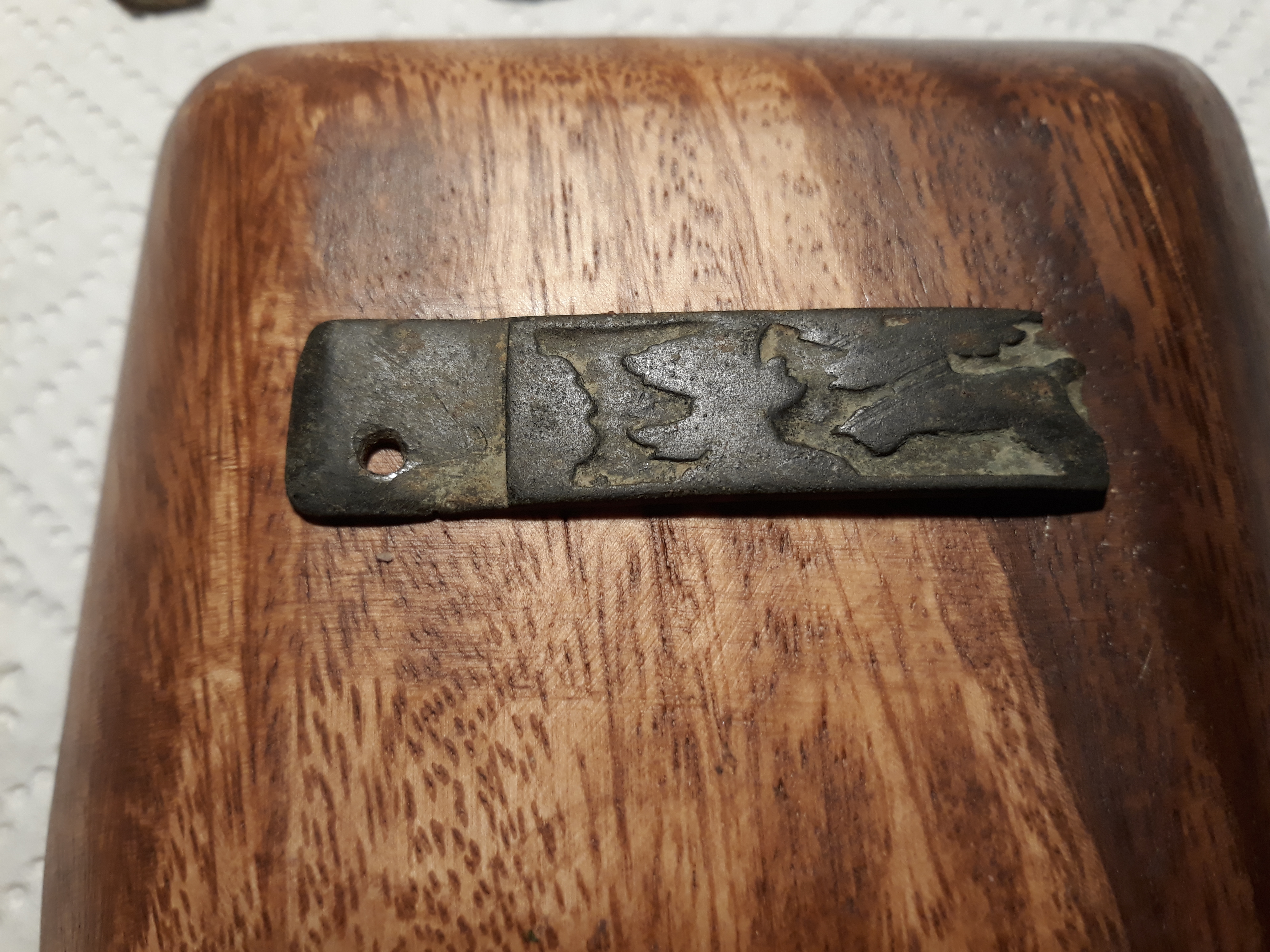denke das wird eine Einlage für einen Messergriff gewesen sein. Jagdszene darauf zu sehen? Jemand eine Ahnung wie alt in etwa? Länge ca 8 cm , Breite 2 cm.