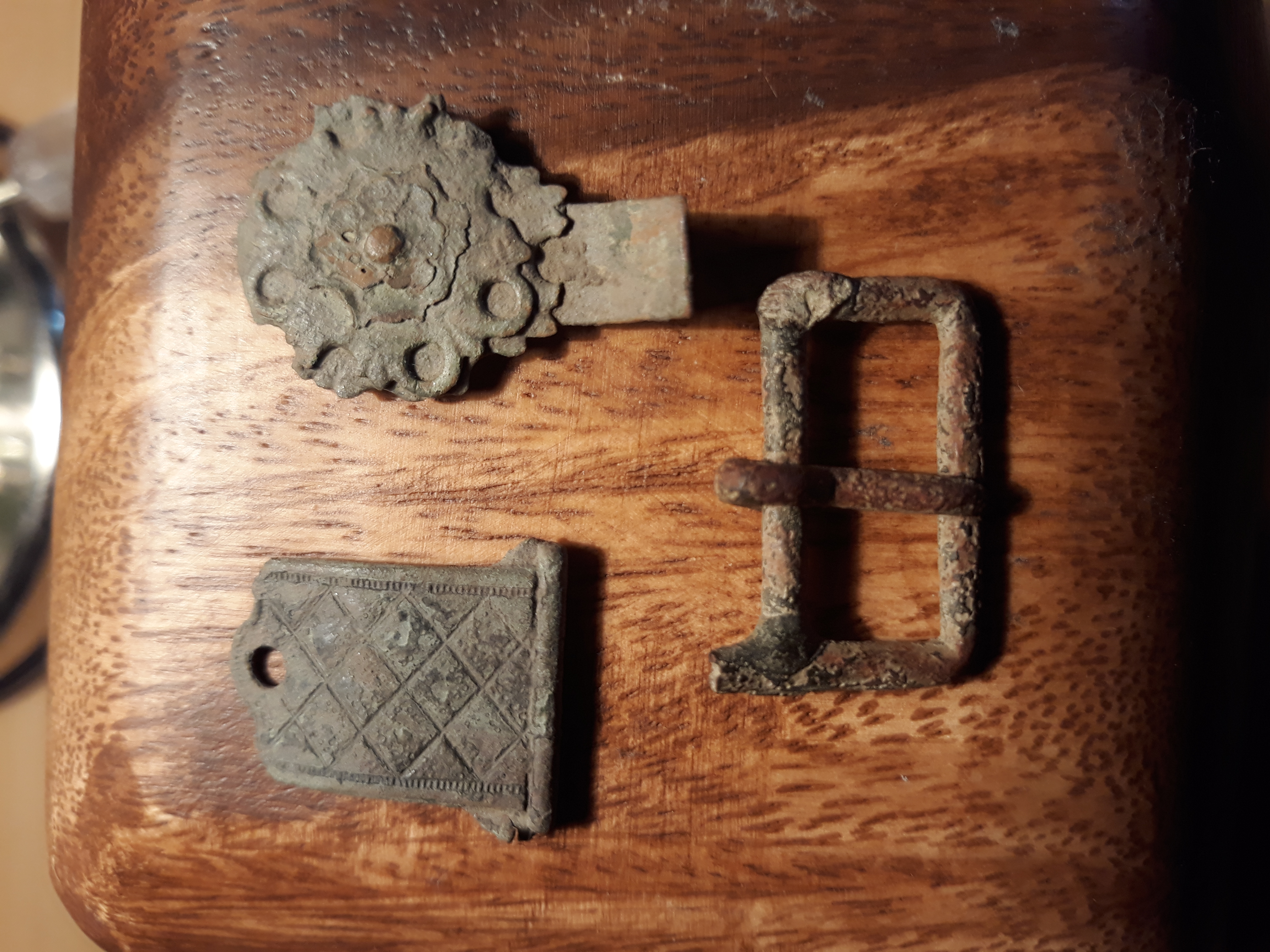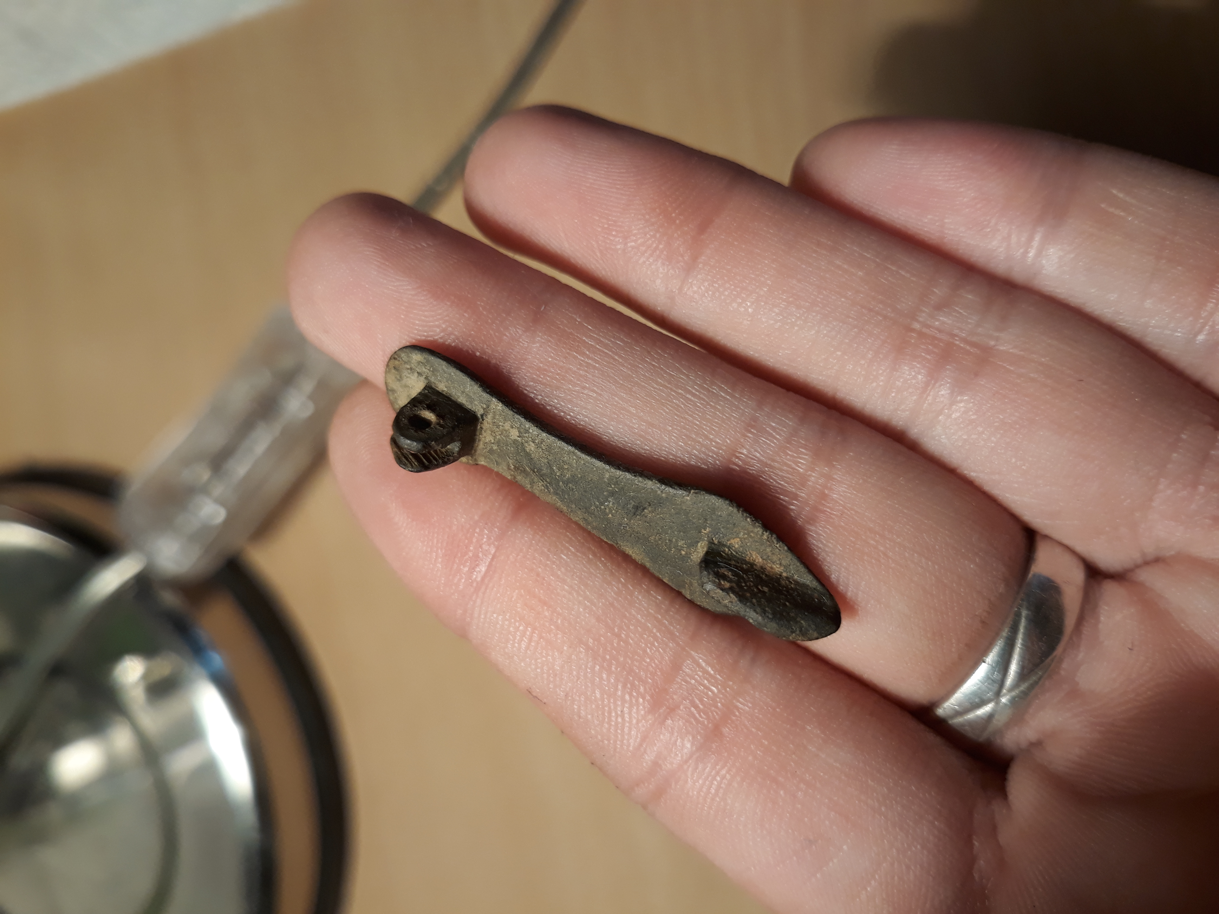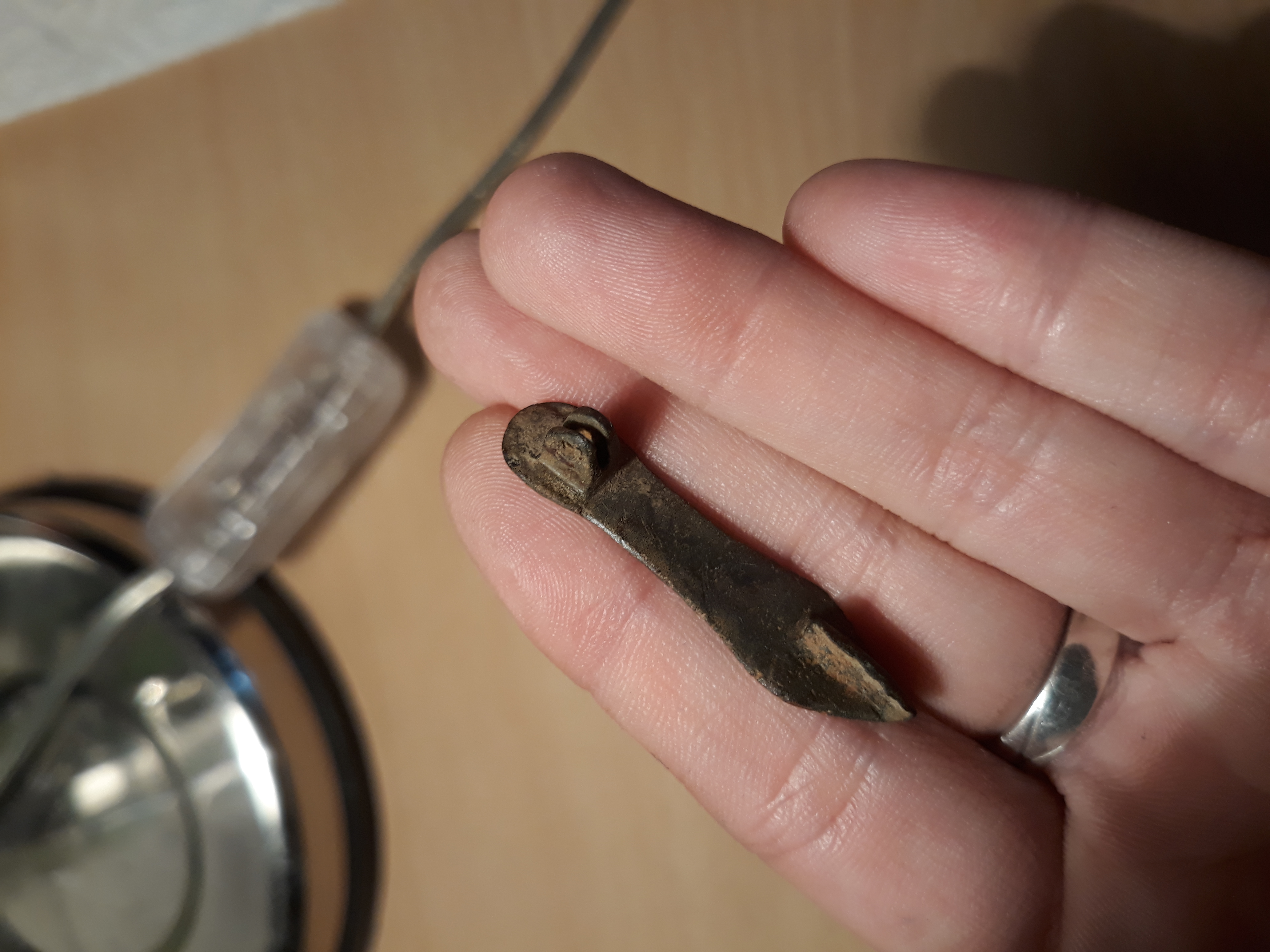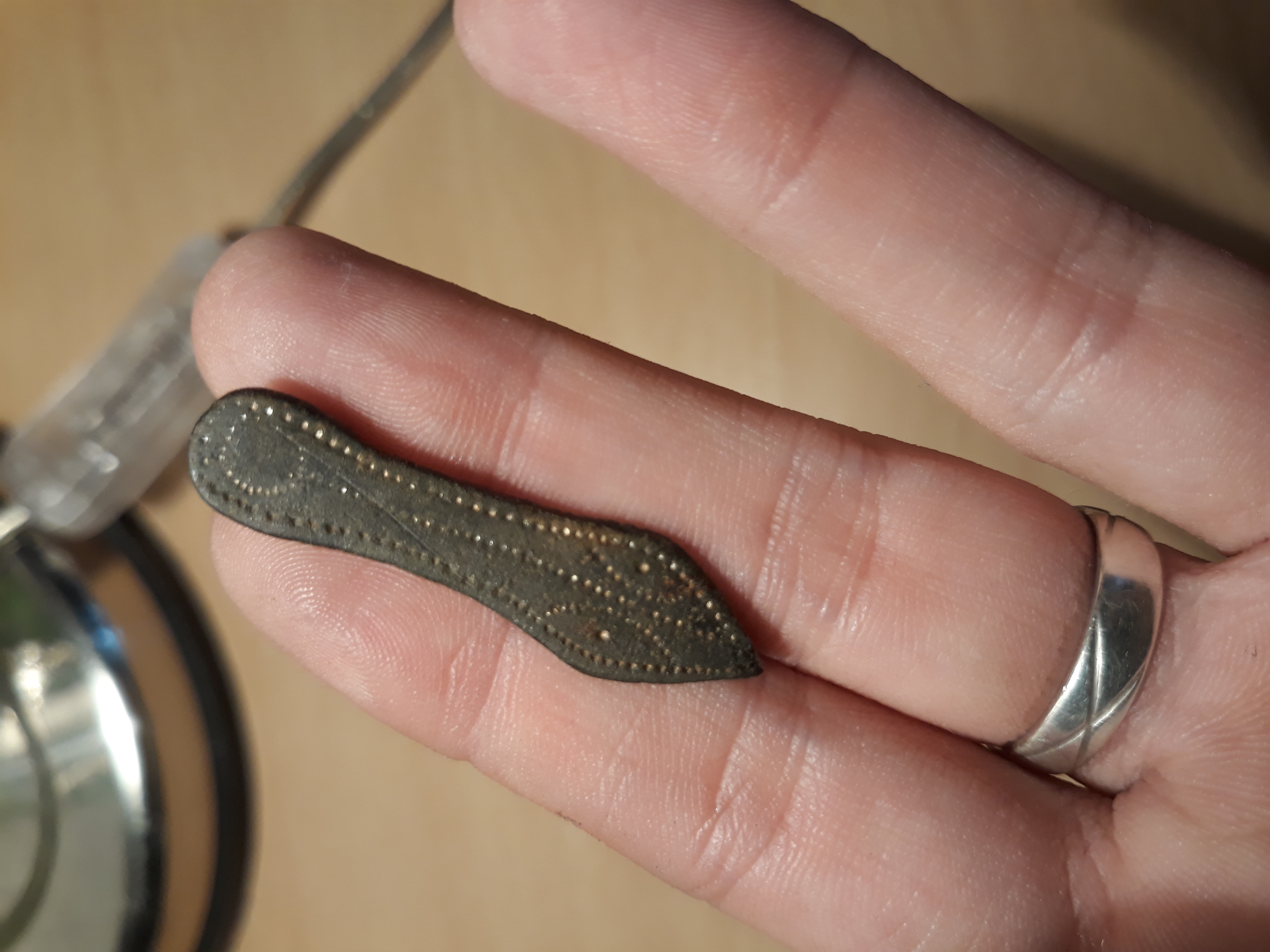 kann jemand sagen welcher Fibeltyp das ist? Sie ist 3,8 cm lang und zwischen 0,5 und 1 cm breit. Scheint vergoldet gewesen zu sein. Nadel fehlt leider.