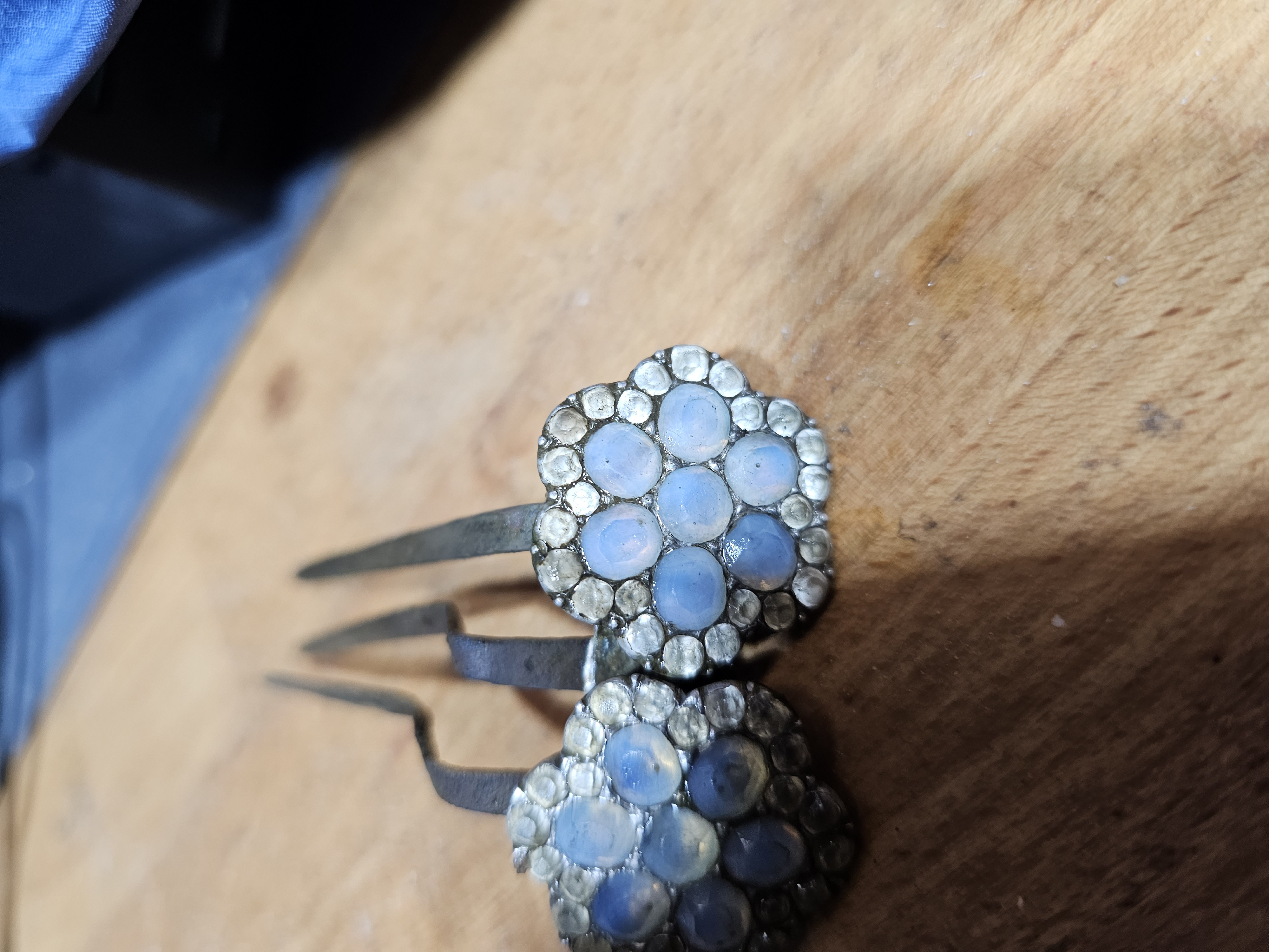 Wir haben heute eine Haarforke mit verschiedenen Steinen gefunden. Die großen Steine scheinen Opale zu sein, die kleineren kann ich leider nicht bestimmen. Kennt jemand ähnliche Gegenstände?