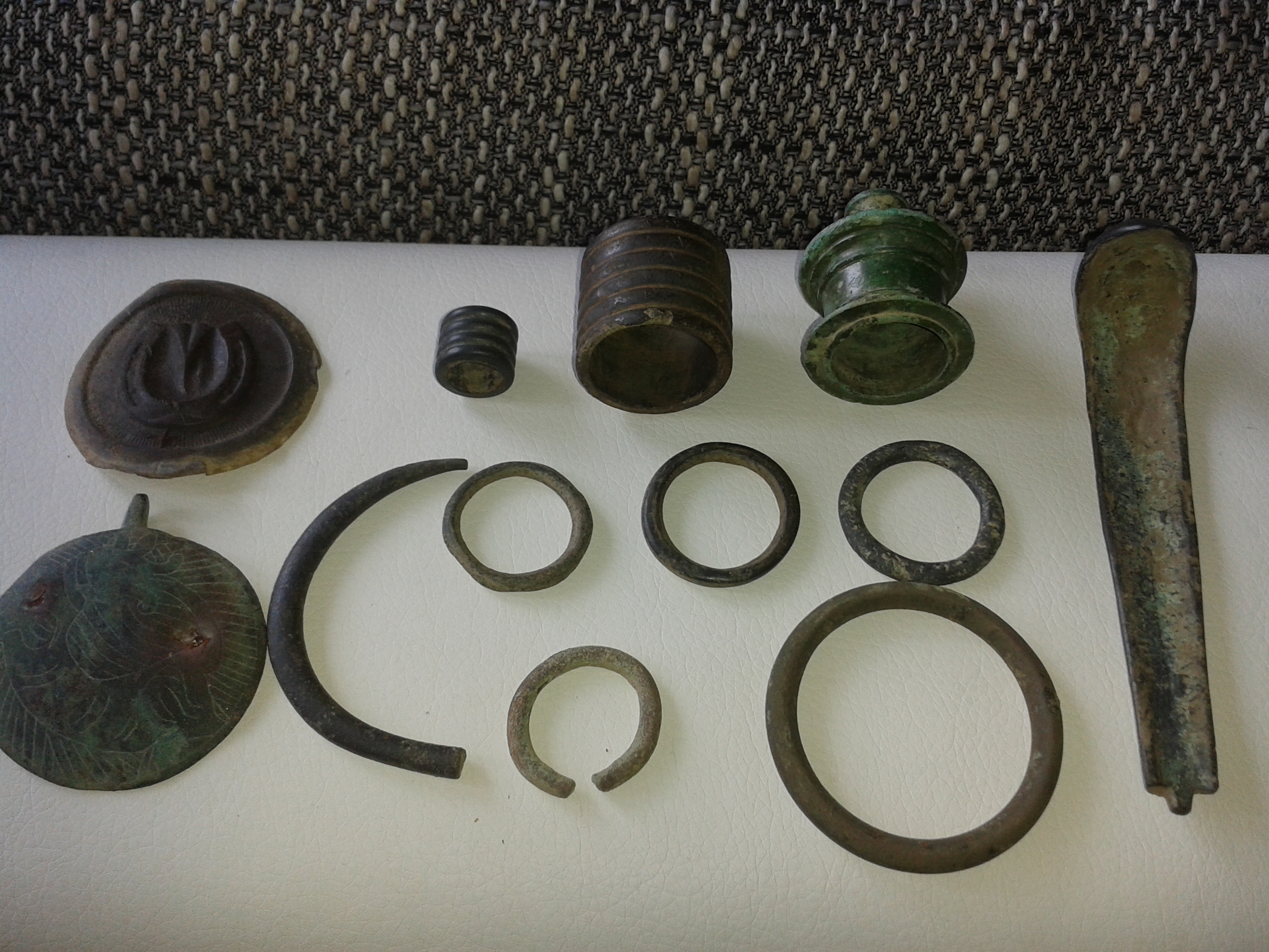 die Ringe sind wahrscheinlich Teile vom Pferdegeschirr oder Ochsen , auch die beiden Hohlzylinder oben mittig. Interessant finde ich das Teil ganz rechts ( Detailfotos wären gut ), den Anhänger mit Öse links unten und das Fragment eines bronzezeitlichen Armreifs, neben den Ringen. Wo die Sachen her sind, mußt du als Finder ja wissen, Fundzusammenhang, Materialangaben und Größe sind immer sehr hilfreich bei der Identifizierung von Bodenfunden.