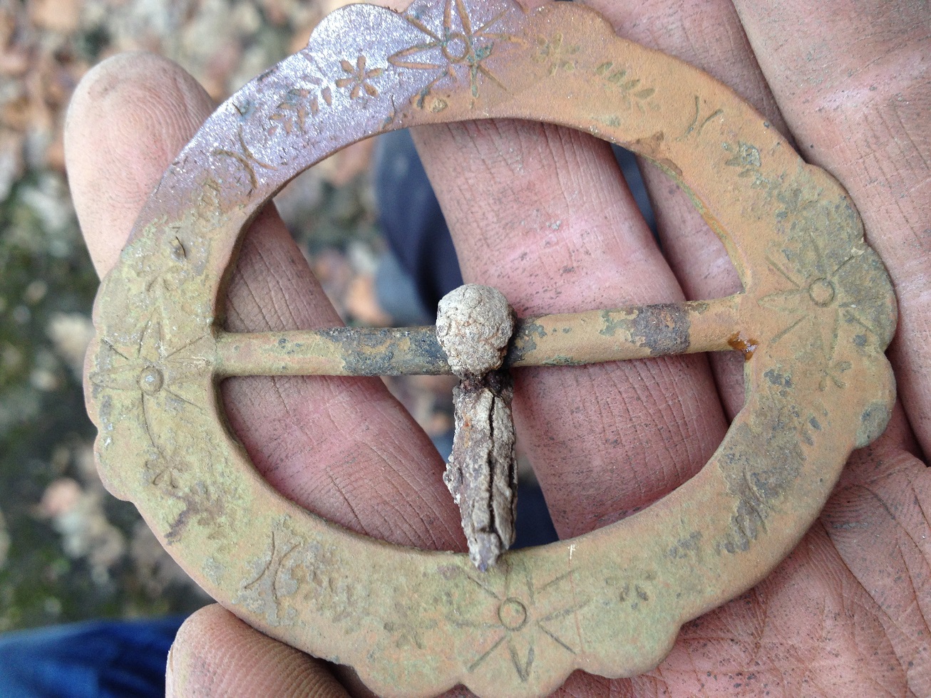 haben im März '13 eine Gürteschnalle in einem Waldbach unterhalb eines Schlosses gefunden - kann Jemand eine Aussage über die Motive/das Alter machen?