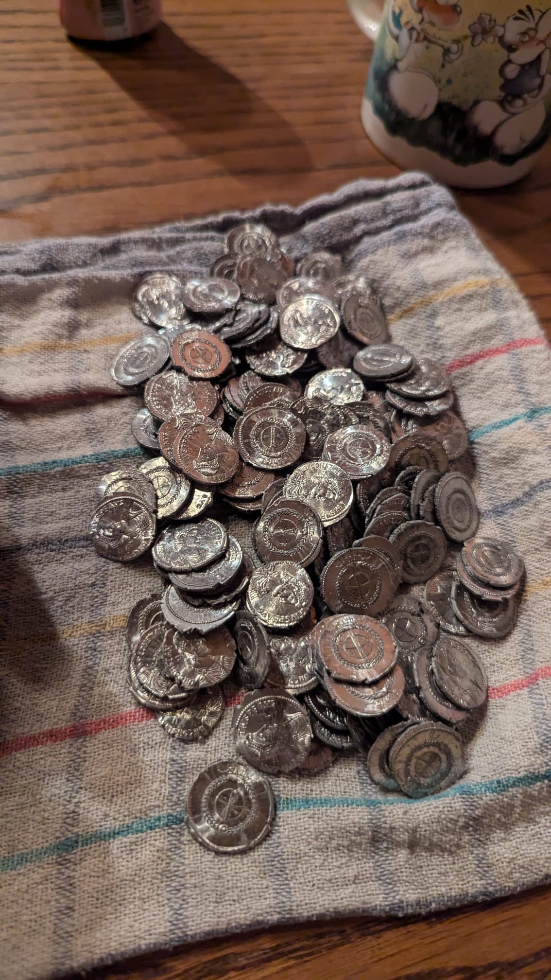 Als siebzehntes wurden insgesamt 85 Siliqua Münzen im Krug arrangiert und 2 Siliqua Münzen auf dem Sockel. Diese wurden alle fest verklebt und lassen sich nicht ohne Beschädigung entfernen. Dieses hatte in Arbeitszeit ca. 7,5 Std. gedauert.