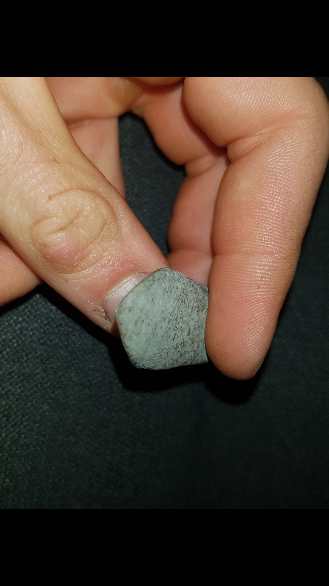Habe diese 2 Stücke schon länger bei mir rumliegen aber frage mich jetzt doch ob es sich nicht um Steinzeitliches Werkzeug handeln könnte. Das Material ist zwar mutmaßlich Basalt, was ungewöhnlich wäre aber ich finde sie haben doch schon sehr "werkzeugähnliche" Formen. Vor allem das längliche Stück ähnelt sehr einem Schaber oder einem Messer da das vordere Drittel und die Spitze (schwierig auf dem Bild darzustellen) wie bei einer Klinge zuläuft und auch recht scharf ist. Auch das kleinere Objekt läuft vorne scharf zu und lässt auch eine dreiecksform wie zum Beispiel bei einer Pfeilspitze erkennen.