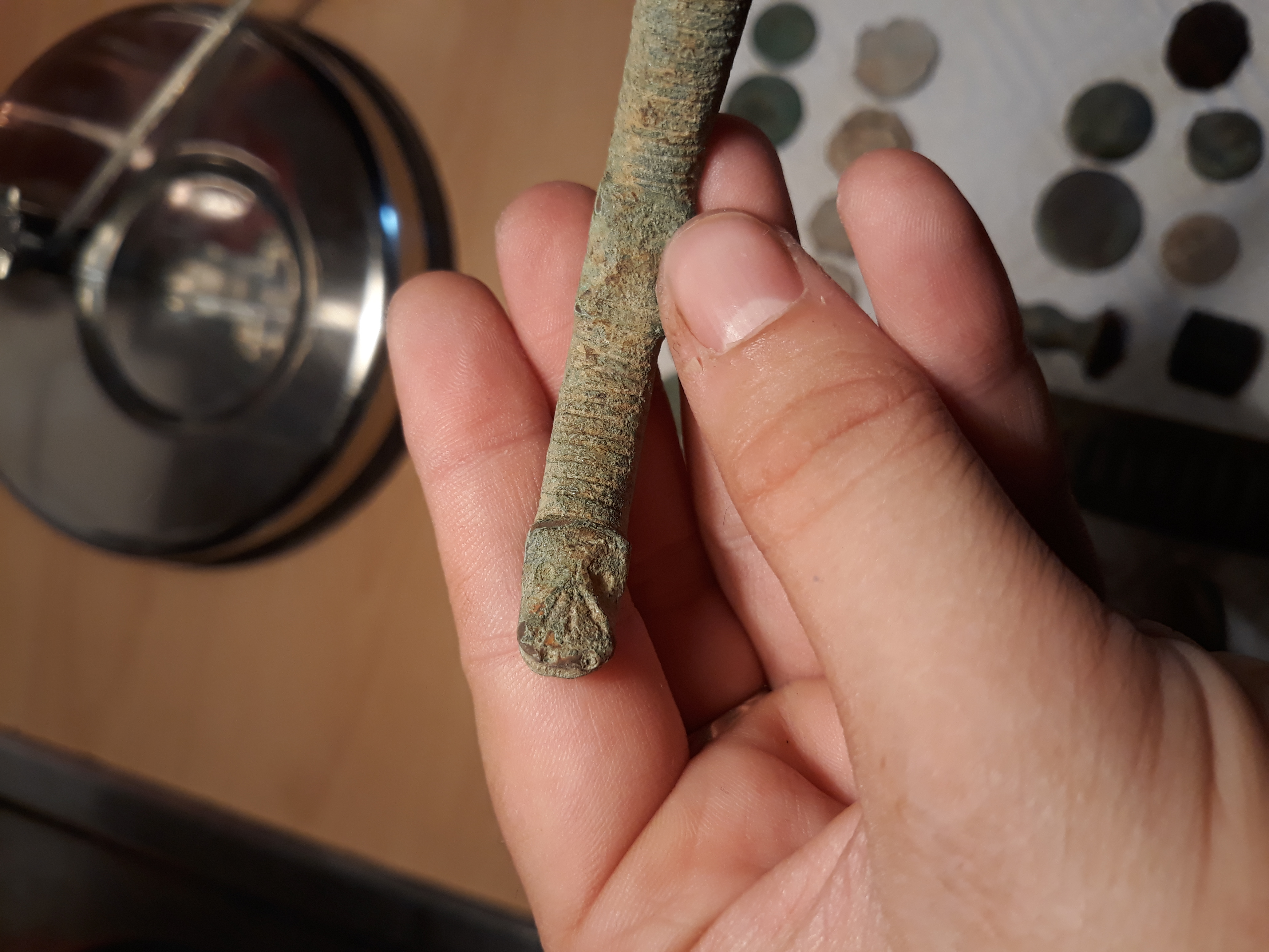 auch war gestern etwas sehr schönes und vermutlich altes dabei. Es hat vorne einen Tierkopf (vermutlich Schlange oder Drache), ist verziert mit Rillen und hat am hinteren Ende zwei unregelmäßige Löcher. Sehr stark gebogen und die Rückseite ist blank. Von der Farbe her, ist es die gleiche wie ein Trensenteil aus der Hallstattzeit, was wir ganz am Anfang gefunden hatten in einem anderem Gebiet. Länge ist etwa 10 cm und Breite 1,5 cm.