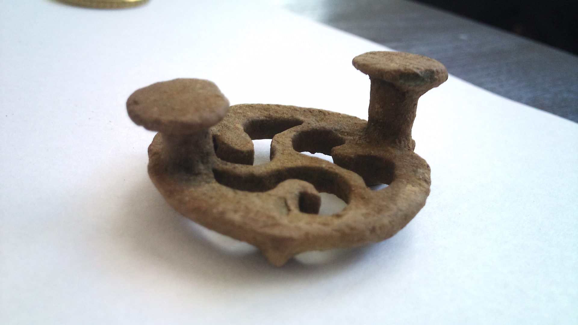 das bronzeteil erinnert mich stark an einen lederbeschlag. anhand der dicke der nieten würde ich auf römisch oder keltisch tippen