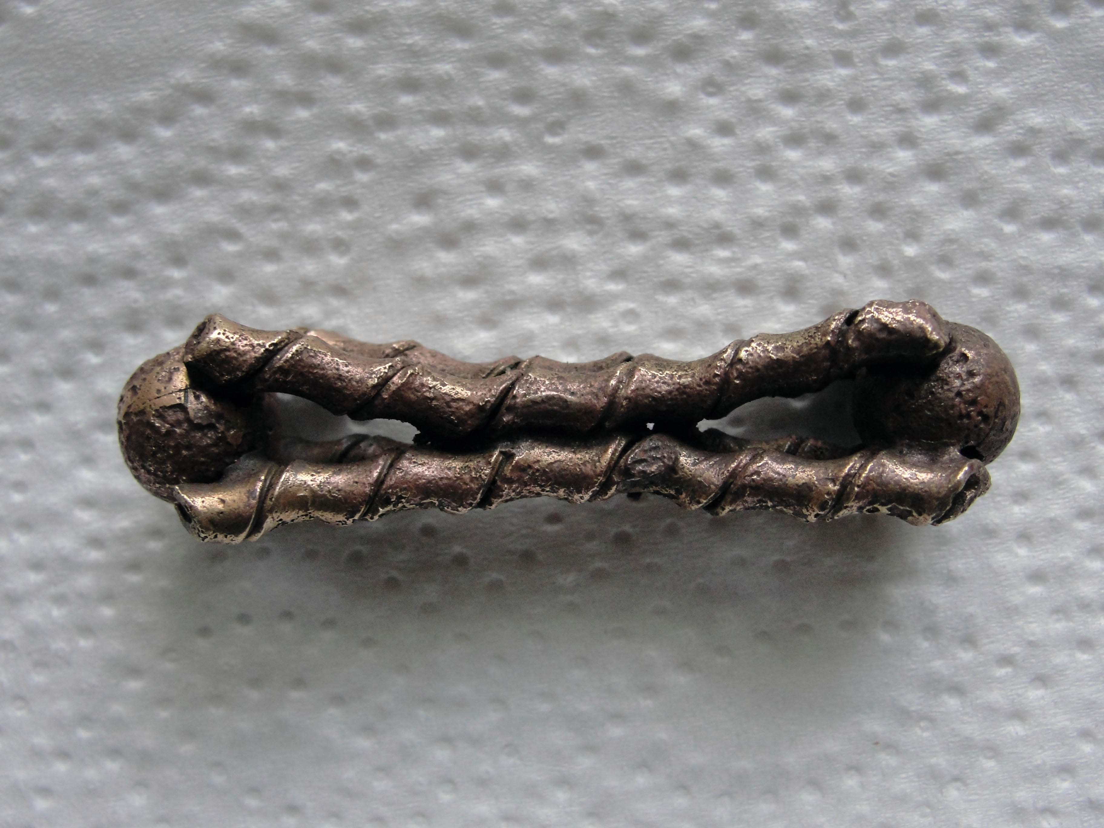 Praefectus hat geschrieben:Ich habe das gute Stück in einem Feucht-/Moorgebiet gefunden. Auf den Fotos ist bereits der Zustand nach der gründlichen Reinigung zu sehen. Gesamtlänge ca. 6 cm. Das Metall (nicht magnetisch) sieht aus wie Gold mit rötlicher Patina. Zudem ist es auch ziemlich schwer für seine Größe. Vielleicht sollte ich morgen mal die Dichte bestimmen. An den Kugeln sind keine Lötstellen. Das Dunkle täuscht - sind lediglich Riefen und Furchen im Metall.