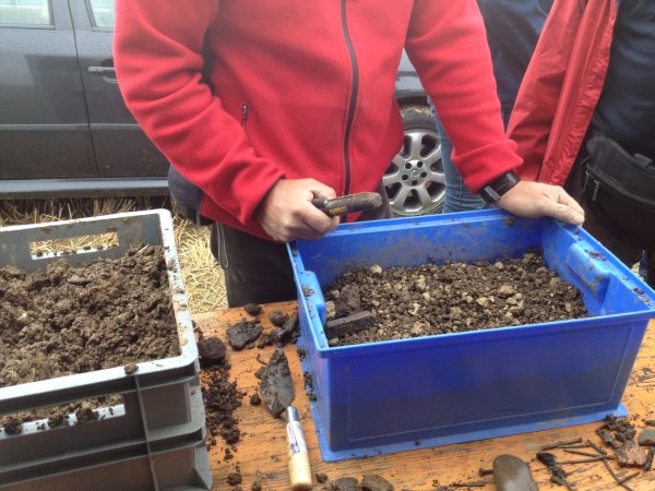 Der Archäologe erklärte die Funktionsweise und die Einsatzgebiete einer Metallsonde und erwähnte auch, dass es neben den kleinen Sonden natürlich auch noch große Metallsuchgeräte gibt. Er erwähnte auch, dass durch die Metalldetektoren Objekte geborgen werden, die ansonsten leicht übersehen werden, da sie mit der Erde verbacken sind.
