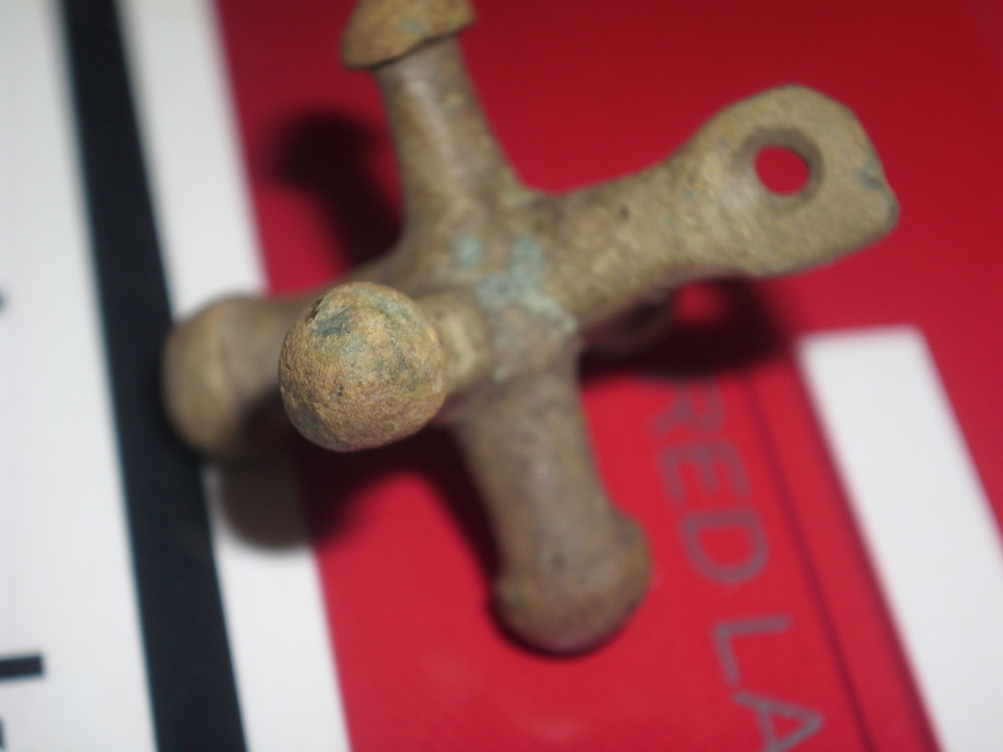 meiner Meinung nach römischer stilisierter 4 facher Phallusanhänger ( Pferdegeschirr ). Habe ein ähnliches Stück zuhause mit einem Phallus weniger, wenn Du willst kann ich Dir ein Foto schicken. Fundzusammenhang war bei mir damals ein aus geackertes römisches Grab, würde auch die Brandspuren an der Lederapplikation erklären.