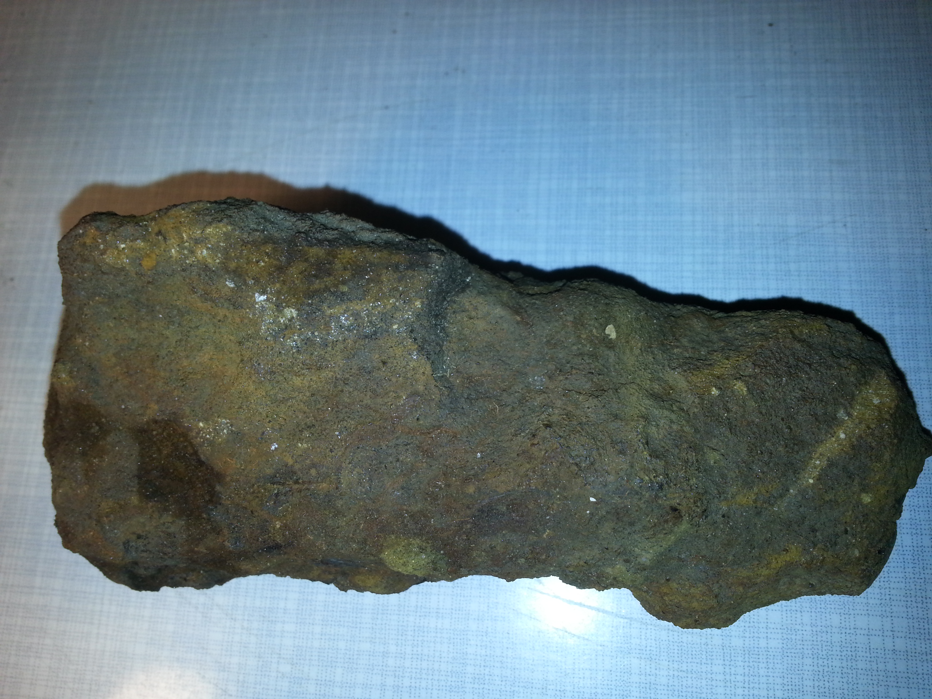 habe diesen Stein vor ein paar Tagen auf dem Acker gefunden . Es ist ca 14 cm lang und wiegt 801 Gramm. Es fühlt sich für die Größe sehr schwer an .