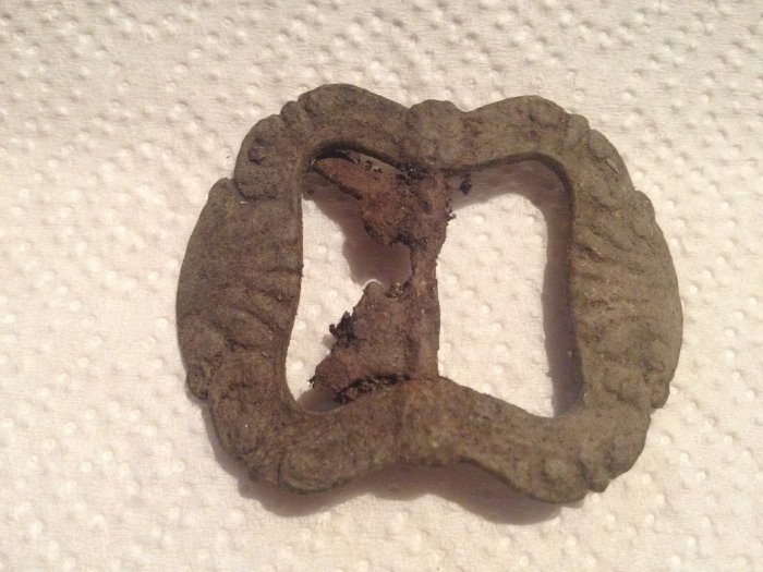 Ich hatte heute diese Schnalle unter der Spule. Ich habe das Teil in einem Wald gefunden, 25 Zentimeter geklemmt unter einer Wurzel.