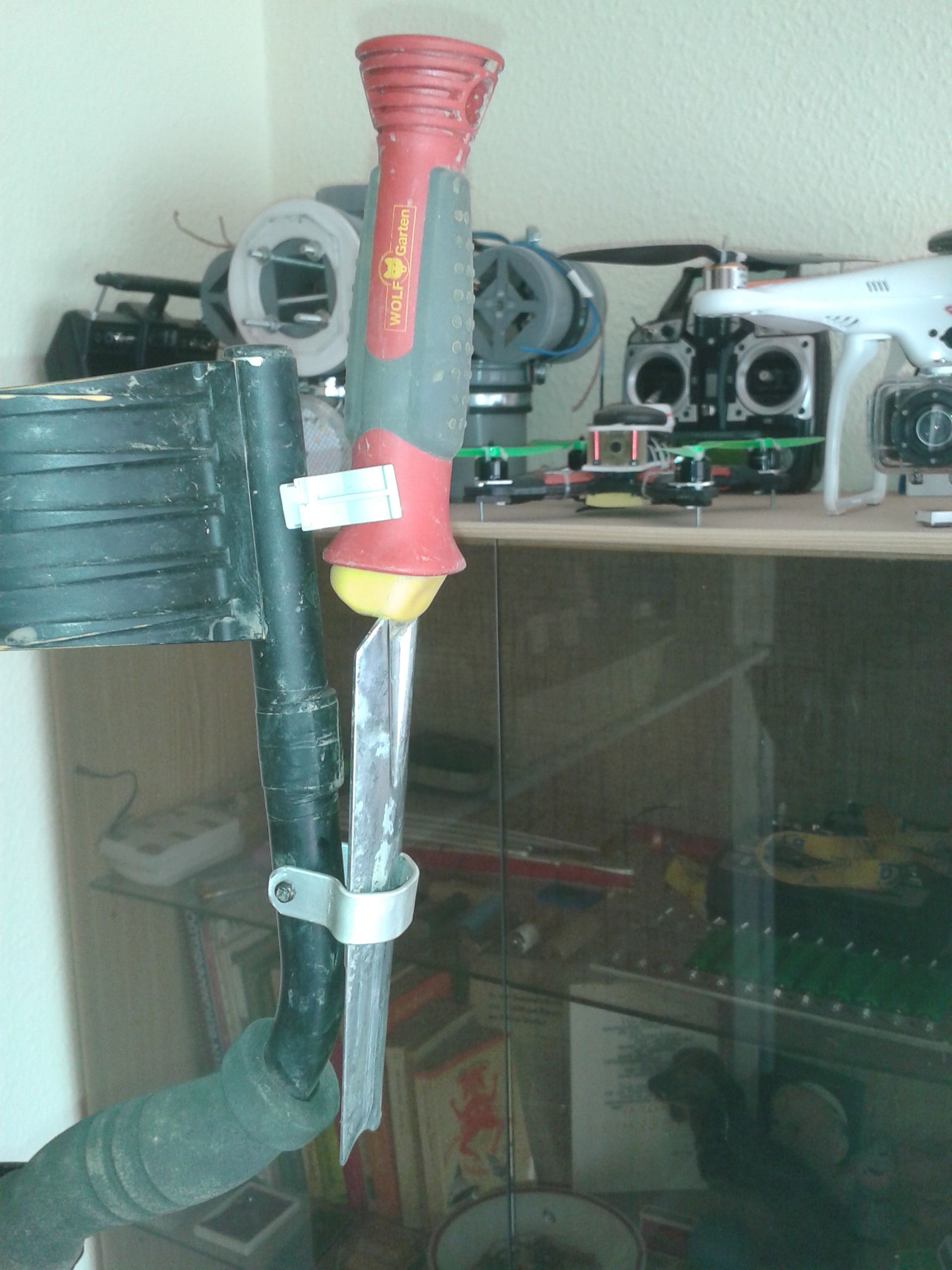 Habe mit einen Stück Alustreifen und einer Klemmschelle für Isolierrohr mein Grabewerkzeug am Detektor angeschraubt. Gruß Klaro