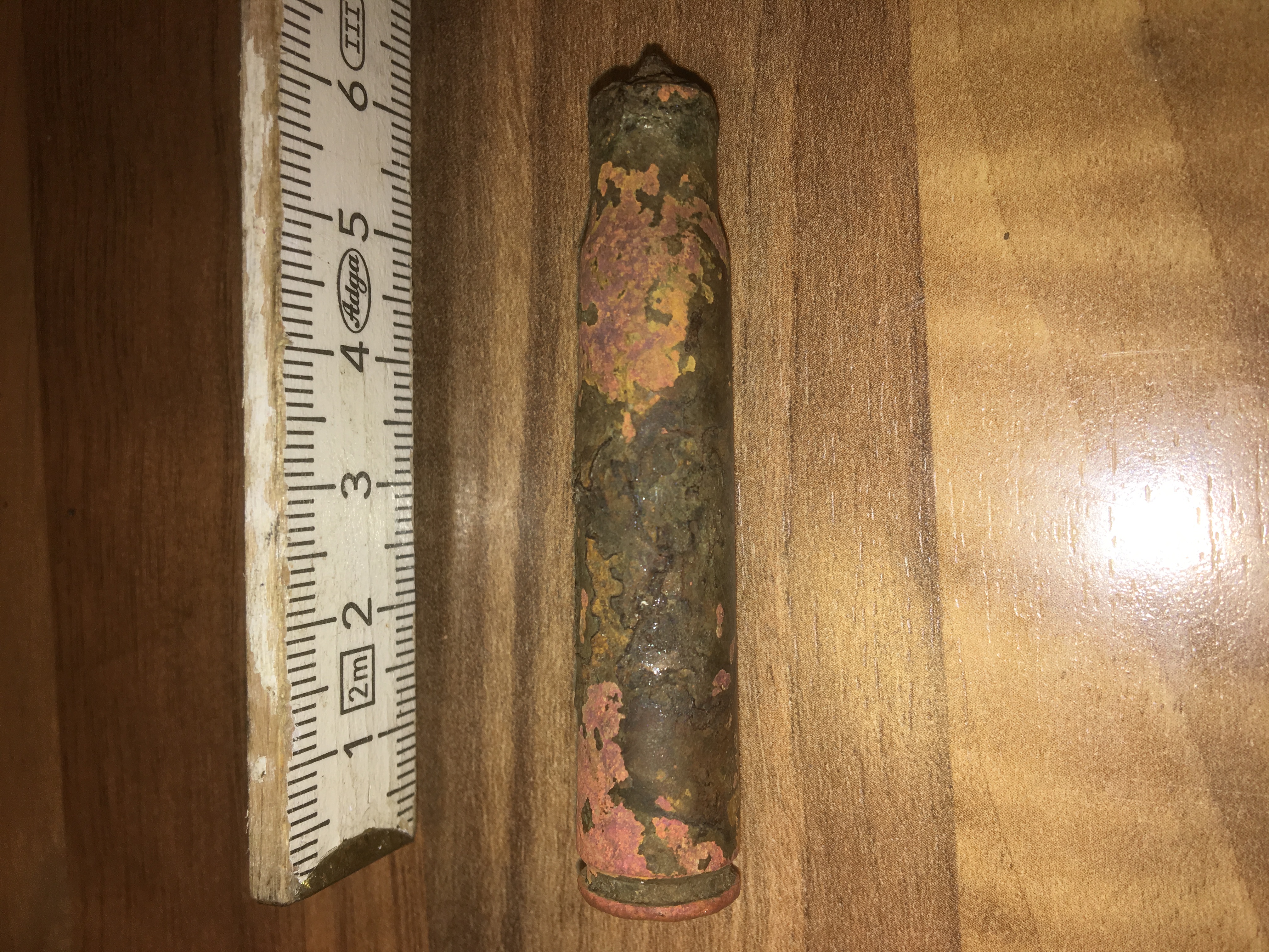 Meiner Meinung sieht das Deutsch aus. Die US Patronen fallen nicht so auseinander. Und wenn es Deutsche Mun ist, würde ich sie nicht mitnehmen, da das Geschoss abgebrochen ist und du nicht feststellen kannst, was für ein Geschoss darin ist. Brand (Phosphor) B Patrone enthält eine kleine Sprengladung. Außerdem ist der Besitz von scharfer Mun ein verstoß gegen das Sprengstoffgesetz.