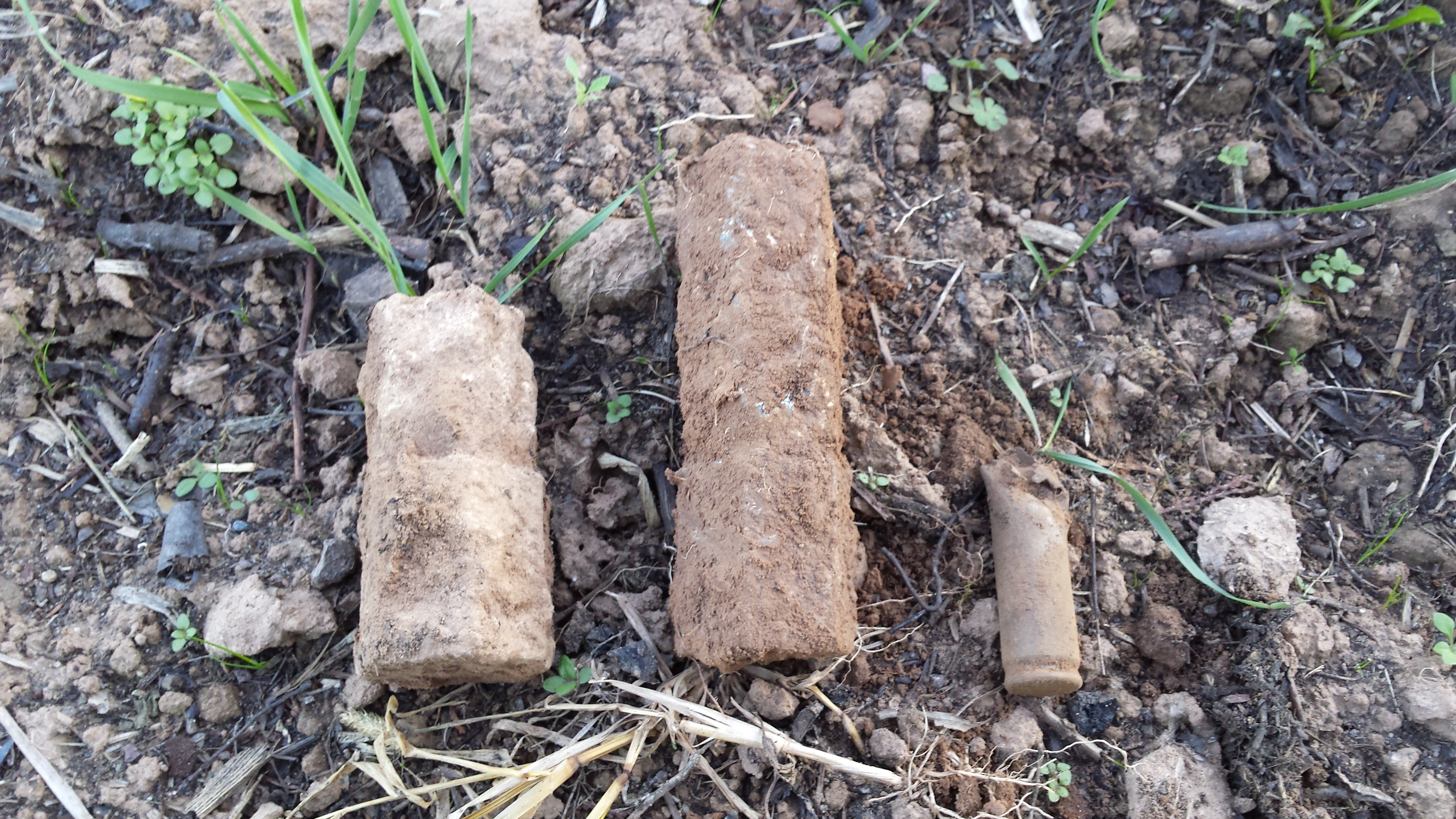 Hatte heute mal sein längerem wieder bissl ZEit für mich und war auf dem Feld unterwegs. Ein bekannter Landwirt hat mich auf einen frisch abgeernteten Acker gelassen. Dort habe ich neber einigen unspektakulären Dingen auch diese 3 Dinge gefunden, die ich dann aber wieder Vorsichtshalber vergraben habe, bis ich weiß was es ist.