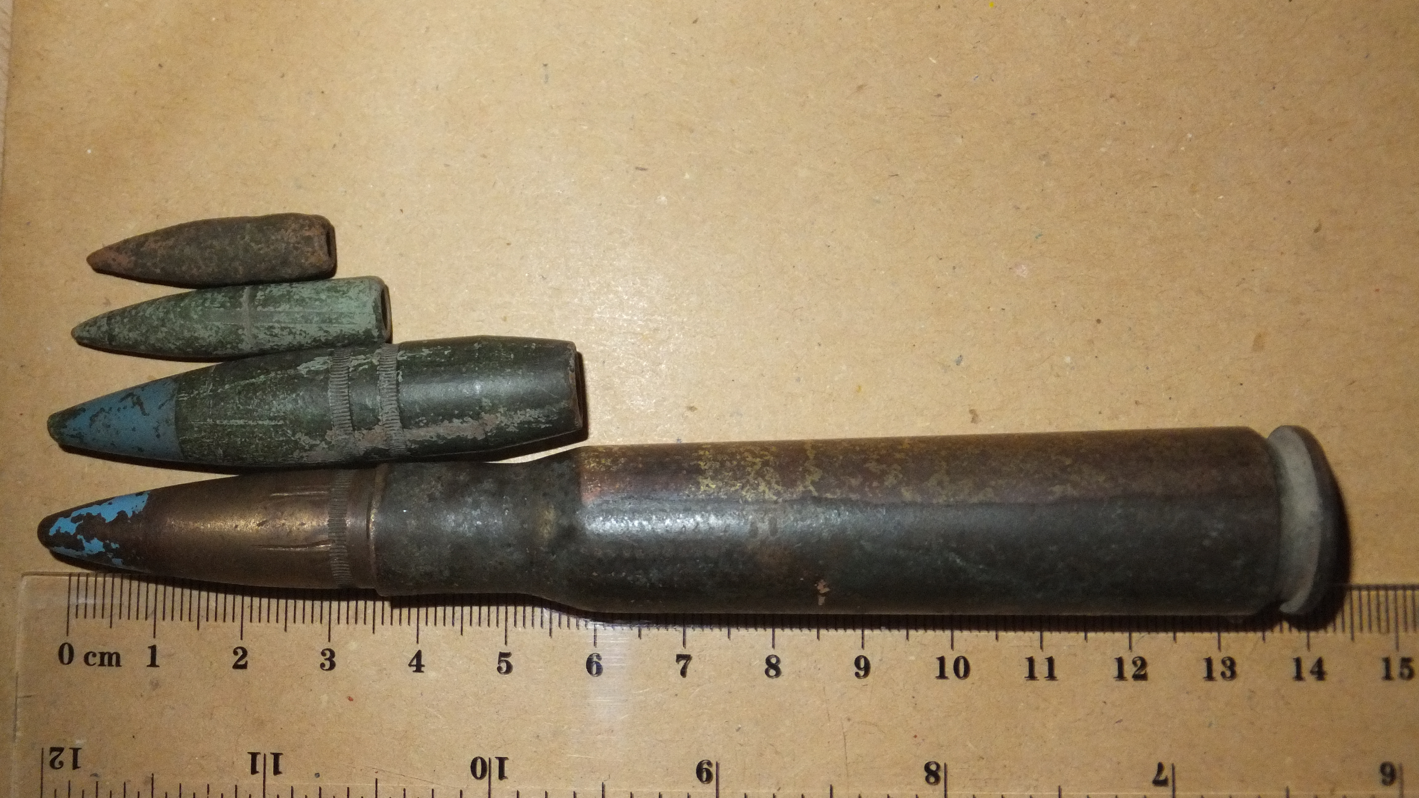 ich hab auch so welche gefunden, auf den hülsen steht als herstellungsjahr 1943. die munition stammt aus zahlreichen fabriken in den usa, die man anhand der bodenstempel bestimmen kann http://harringtonmuseum.org.uk/USACartHeadstamps.htm, bei meinen beiden hülsen dm für Des Moines Ordnance Plant, Des Moines, Iowa, USA und lc für Lake City Army Ammunition Plant, Independance, Mo., USA. soweit ich weiß wurden die browning machine guns in flugzeuge, auf bodenfahrzeuge montiert, und auch auf lafetten benutzt. sind schon beeindruckende patronen.