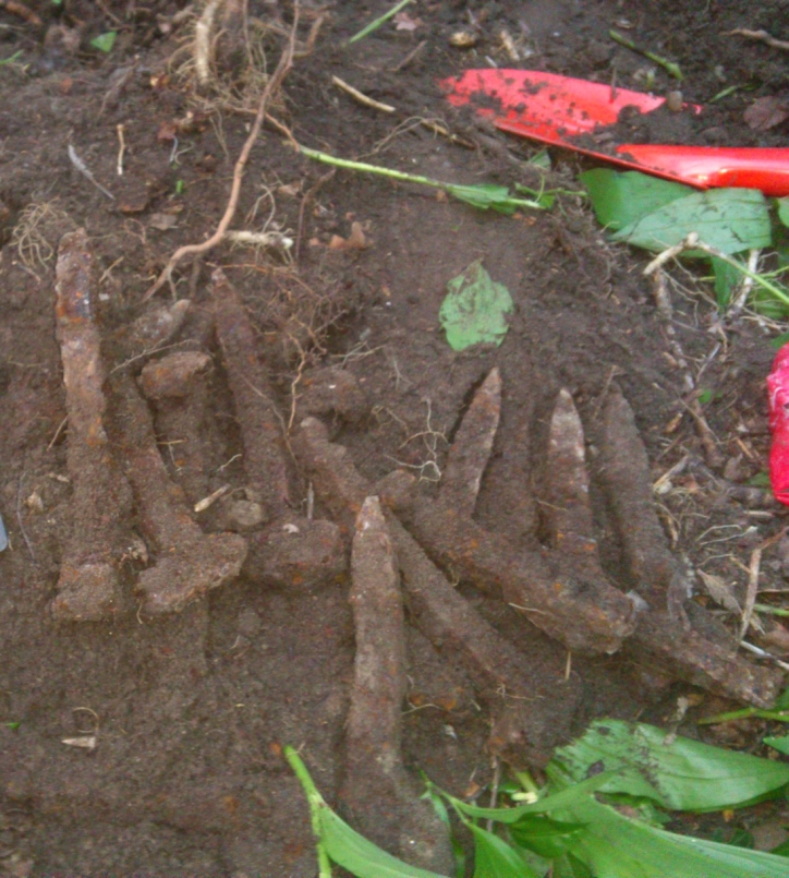 3) Metallpfähle ca. 15 Zentimeter... einen ganzen Haufen hab ich gefunden, sehr schwer, Vollmetall Eisen... Dachte zuerst Zeltheringe.. Aber dafür scheinen sie zu dick. Irgendwelche Ideen? In der Nähe war auch eine leere Patronenhülse und