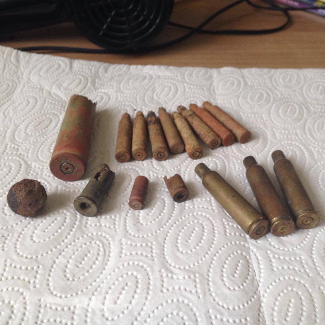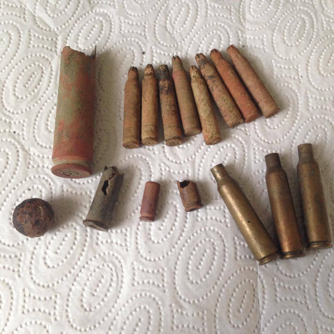 Obere Reihe: Reste einer Cal.50 Hülse, dann Manövermun. Kal. 223 Nato