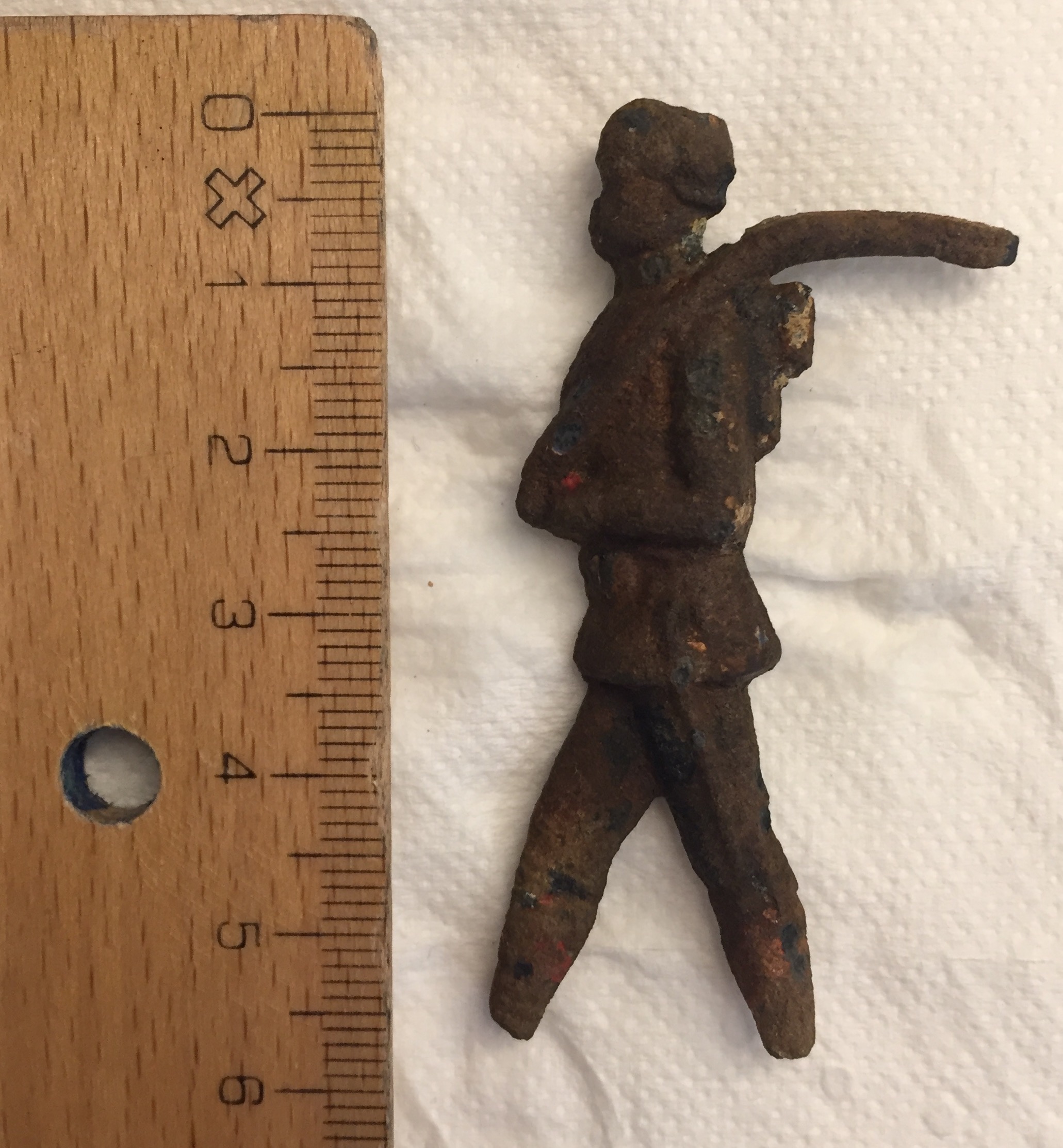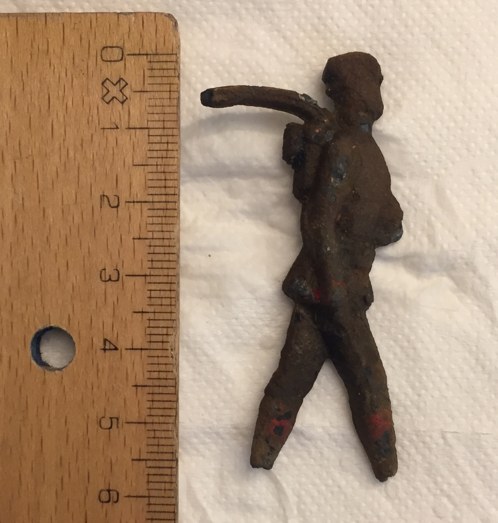 Bei einer kleinen Runde im Wald haben wir neben diversen Patronenhülsen vom Jäger, der wohl zum Einsammeln zu faul war, und Fünf Reichspfennig von 1924 eine kleine Figur gefunden, die etwas auf der Schulter trägt. Leider haben wir keinerlei Vorstellung was das sein könnte.