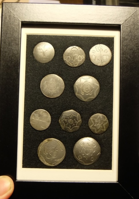 Der kleinste Knopf hat einen Durchmesser von 11mm (rechts oben) und der größte (rechts unten) von 35mm. Sind zwar nicht viel und alle schön aber es gibt bestimmt welche die haben mehr und schönere.