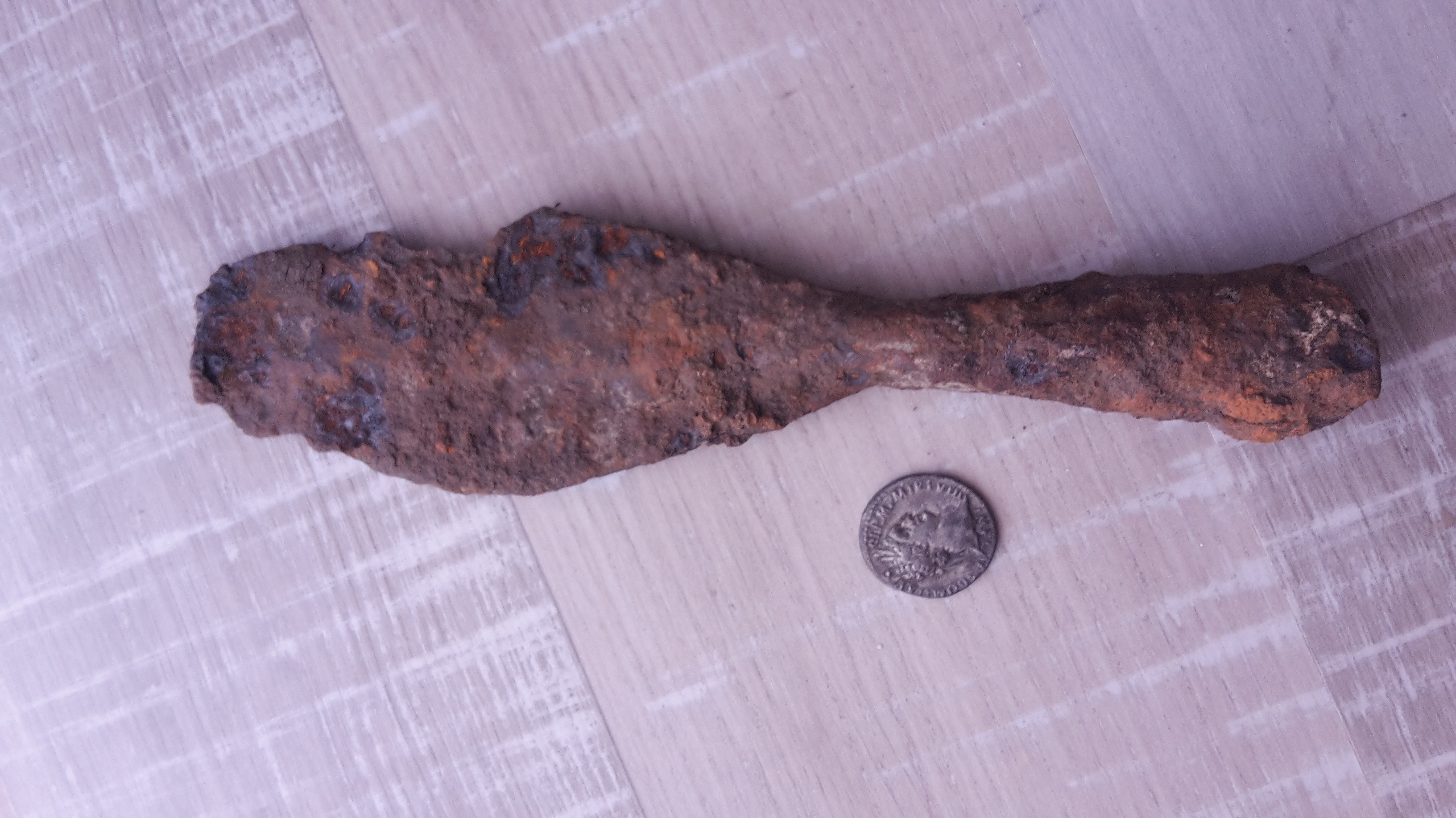 Die Römermünze weiß ich nicht . Aber das Eisenteil sieht wie ne Lanzenspitze aus . Ist da eine Tülle zu sehen. ?Fotos von allen Seiten wäre gut.