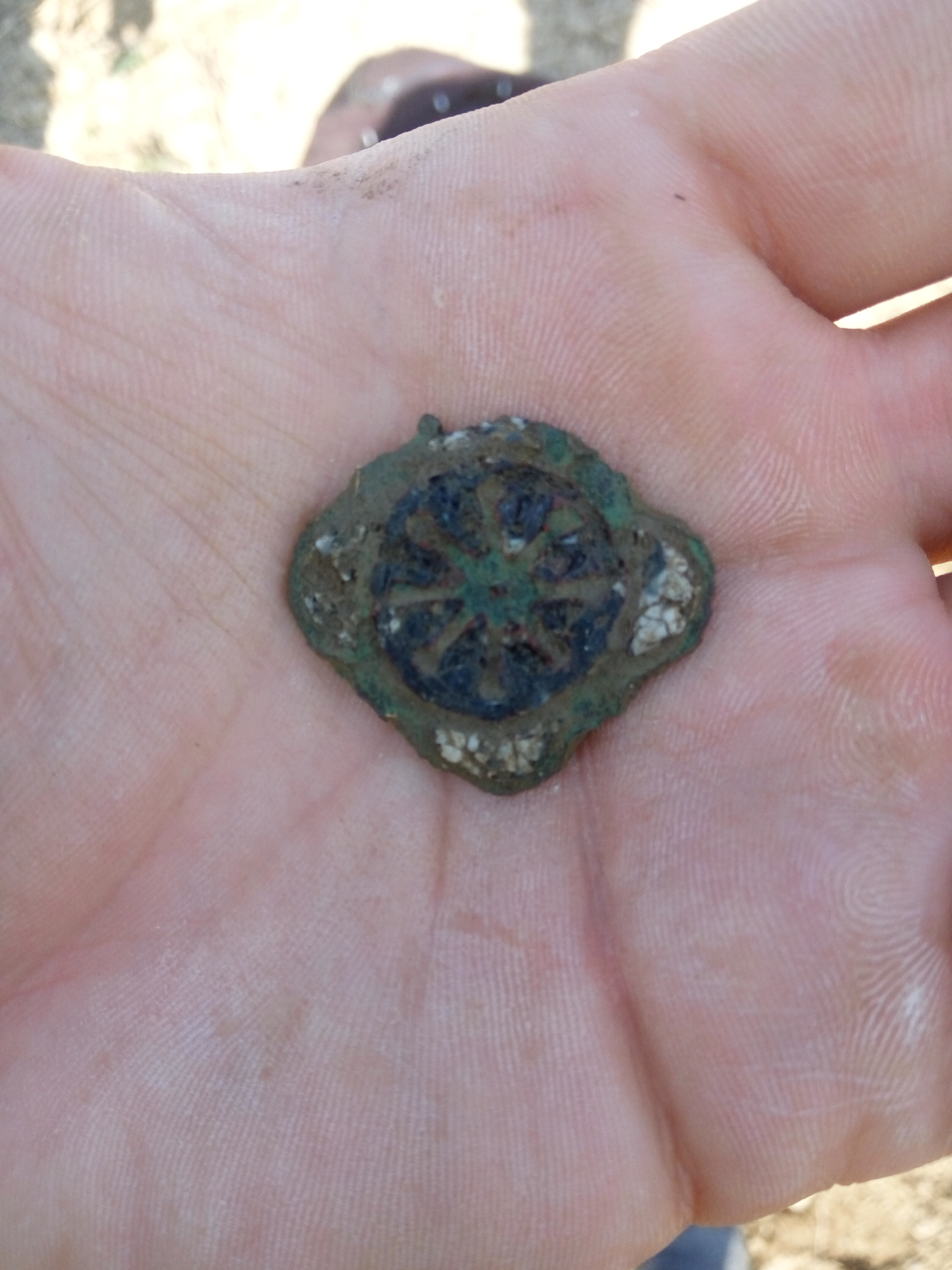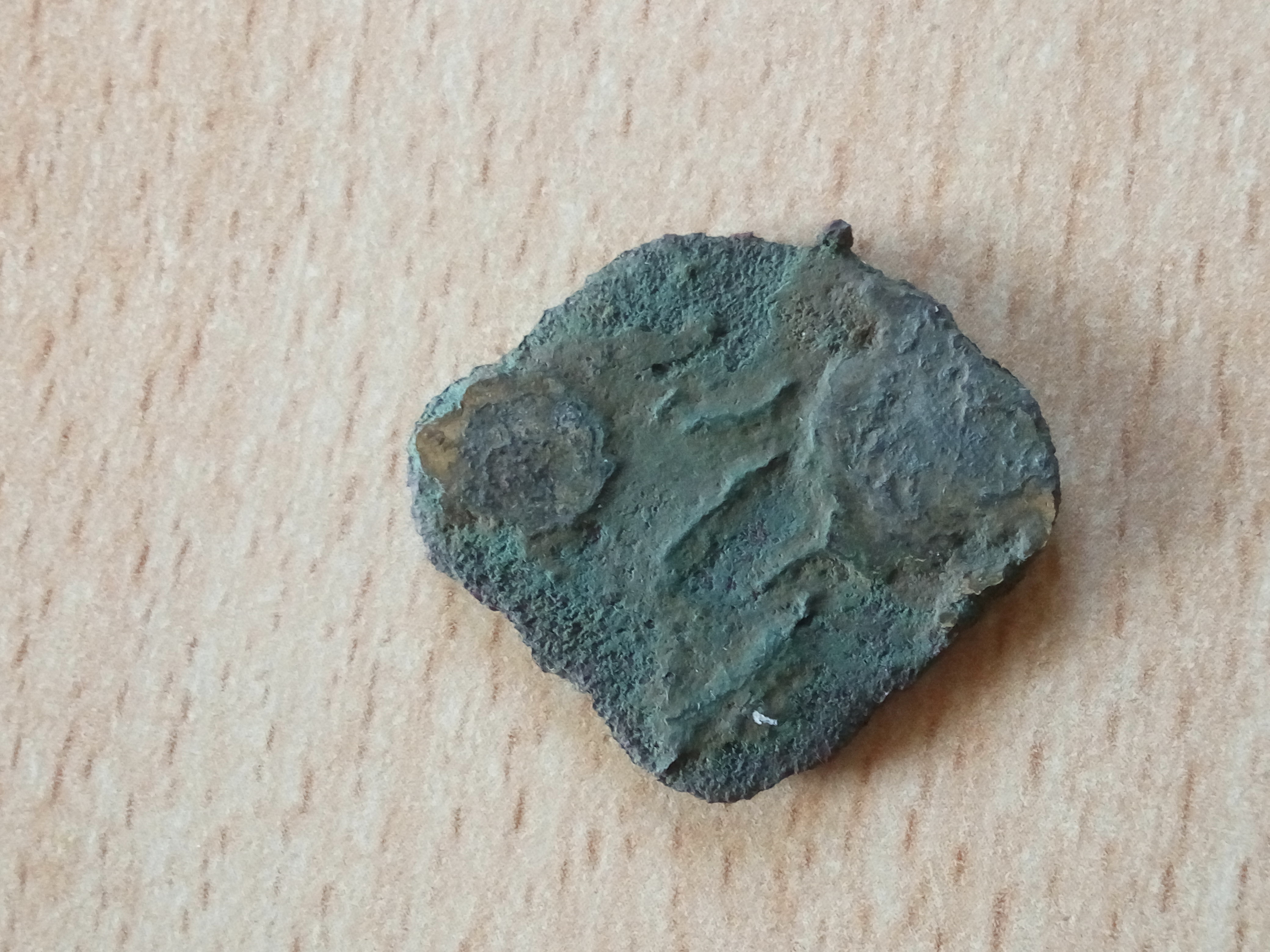 War etwa 25cm im Acker, Leitwert um die 80, sieht mir nach Bronze aus. Die Größe ist 3cm x 2,6cm. Weitere Infos kann ich auf Anfrage liefern
