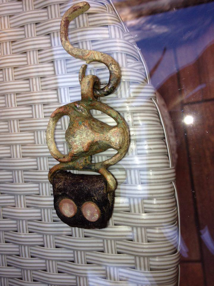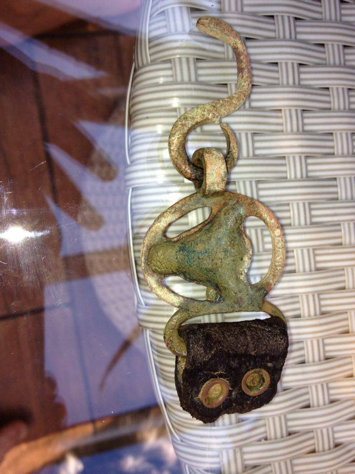 Wir haben heute beim sondeln diese Gürtelstück(?) in der Umgebung einer villa rustica gefunden. Der Haken stellt eine Schlange dar (eingezeichnetes Reptilienmuster), der Mittelteil besteht aus einem Stierkopf und ein vernietetes Stück Leder ist auch noch dran. Ich kenn mich mit römischen Tierikonographien leider gar nicht aus und, dass das Leder noch dran ist, macht mich auch ziemlich stutzig..