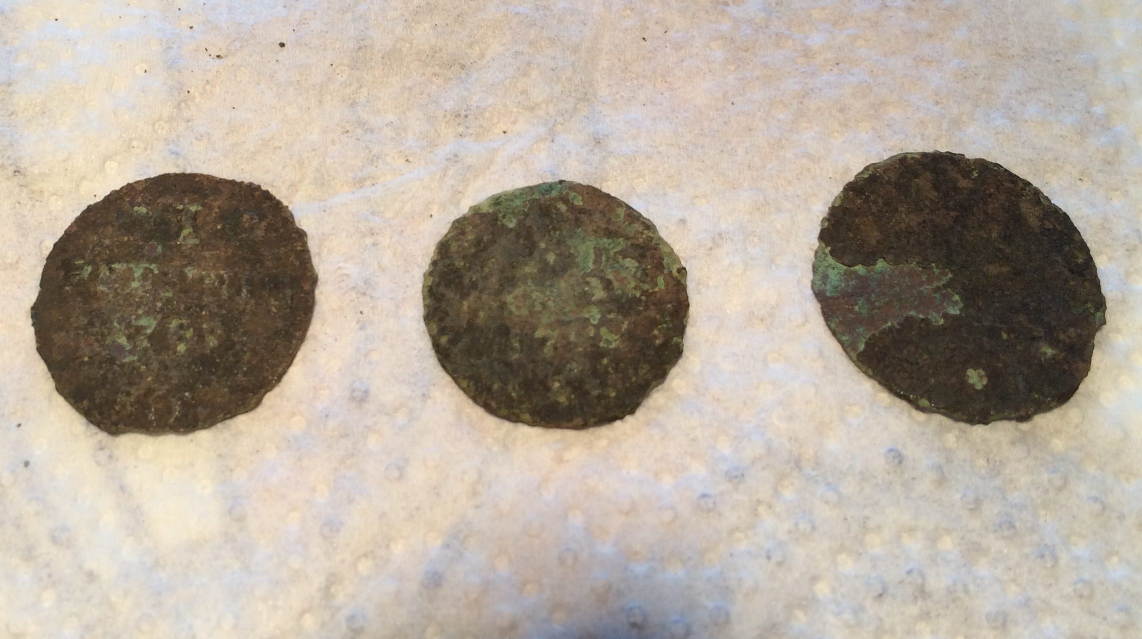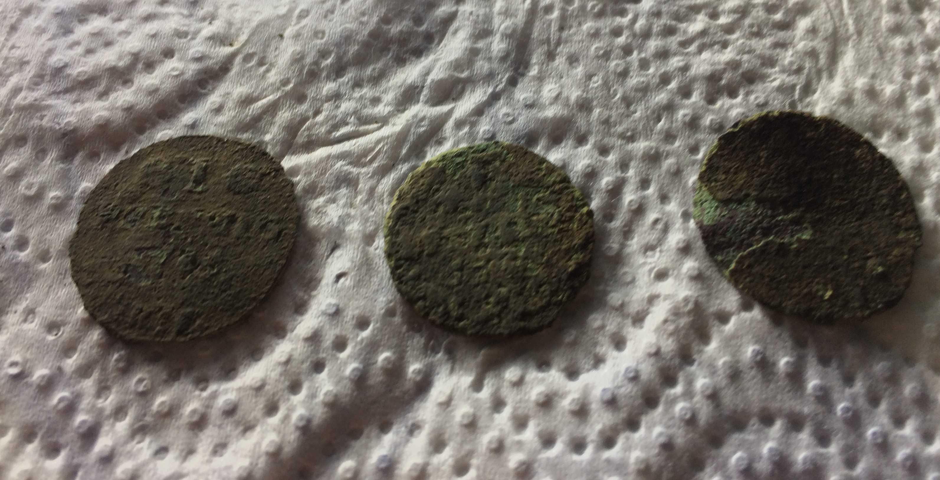 War schwierig Fotos zu machen auf denen man was erkennt. Vielleicht weiss jemand um welche Muenzen es sich handelt? Auf der Rueckseite ist einmal ein C oder G von einem Kreis umgeben mit einer Krone obendrauf, auf dem anderen ein stehendes Tier ebenfalls von einem Kreis umgeben