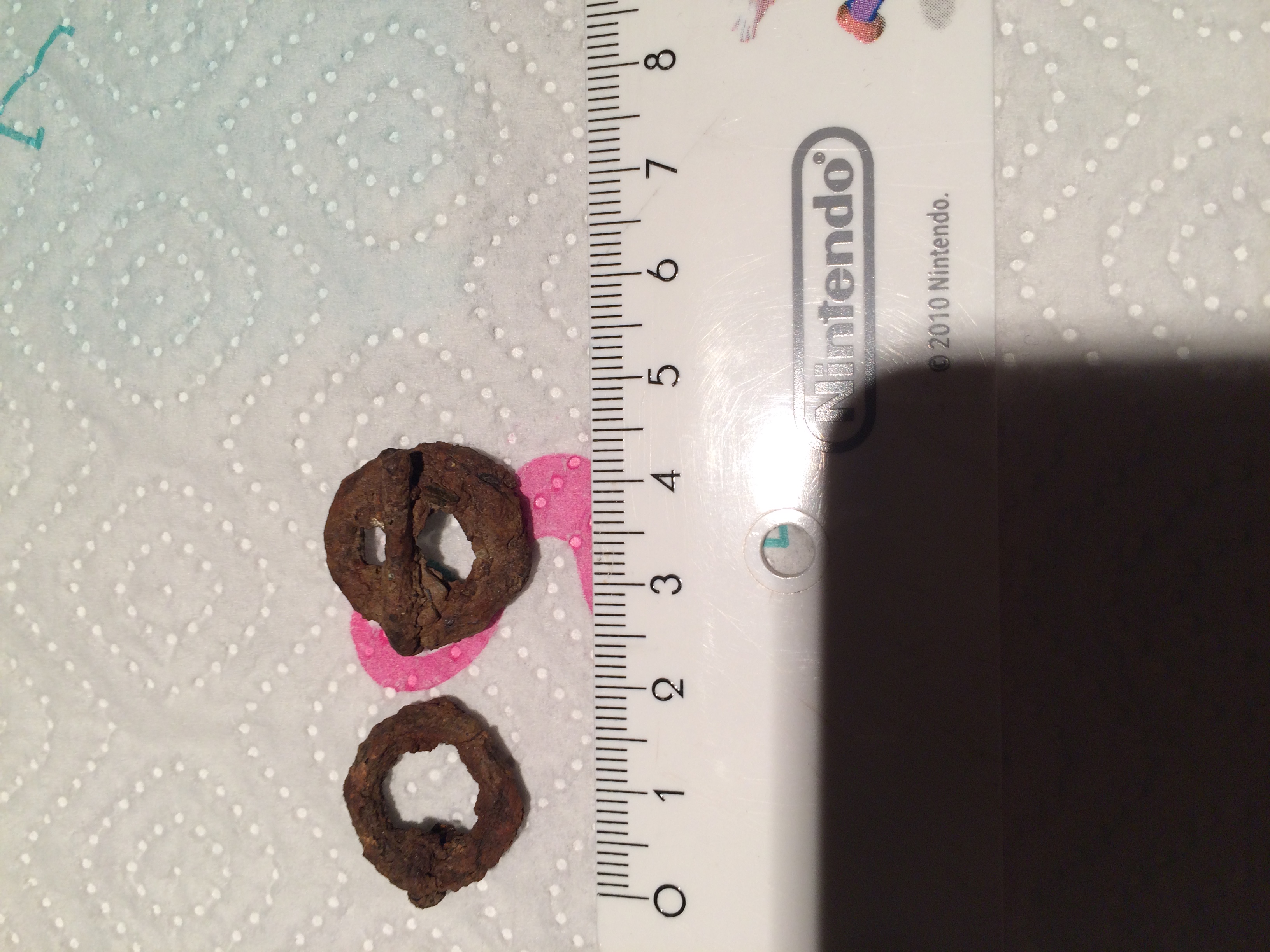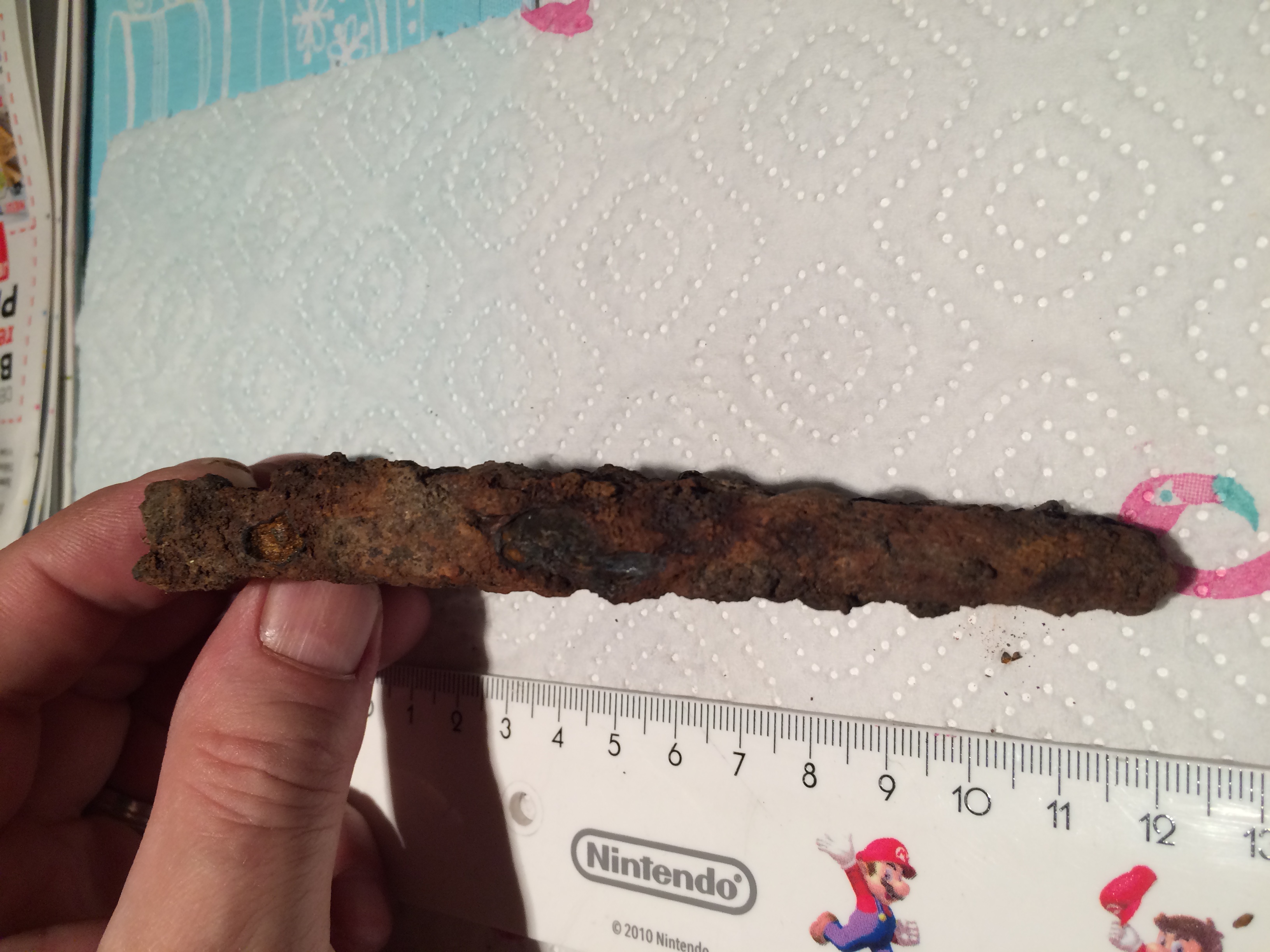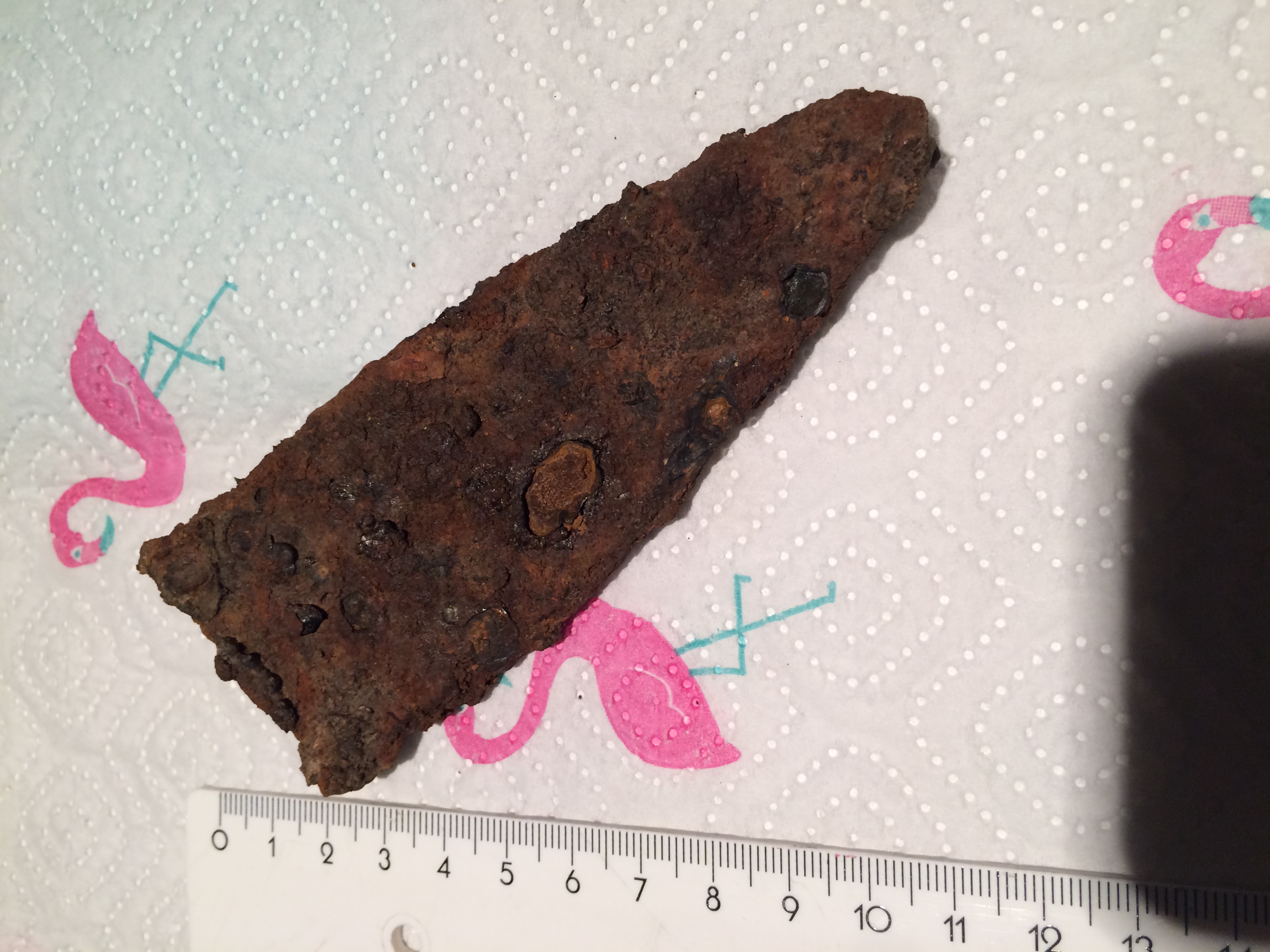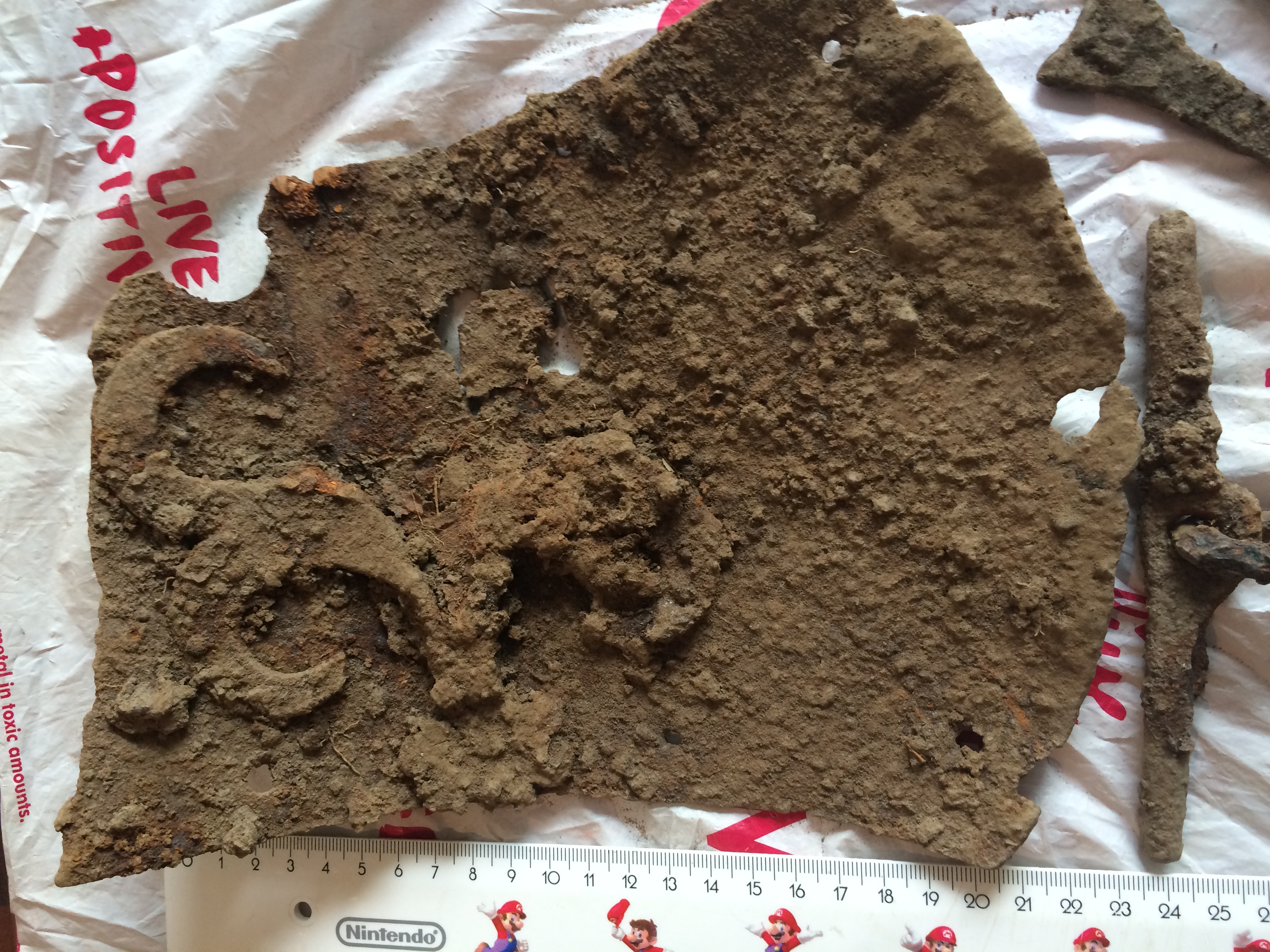 Was jetzt nicht stimmig ist, die Platte ist verhaeltnissmaessig gross - 23 cm lang. 2. Punkt, sie hat eine Woelbung die aber in die falsche Richtung geht da die Verzeihrung sicher aussen war - gut die Woelbung kann auch spaeter da rein gekommen sein. 3. auf der linken und unteren Seite sind Locher, vermutlich zum Befestigen, koennten aber auch Nieten von der Ruestung drin gewesen sein