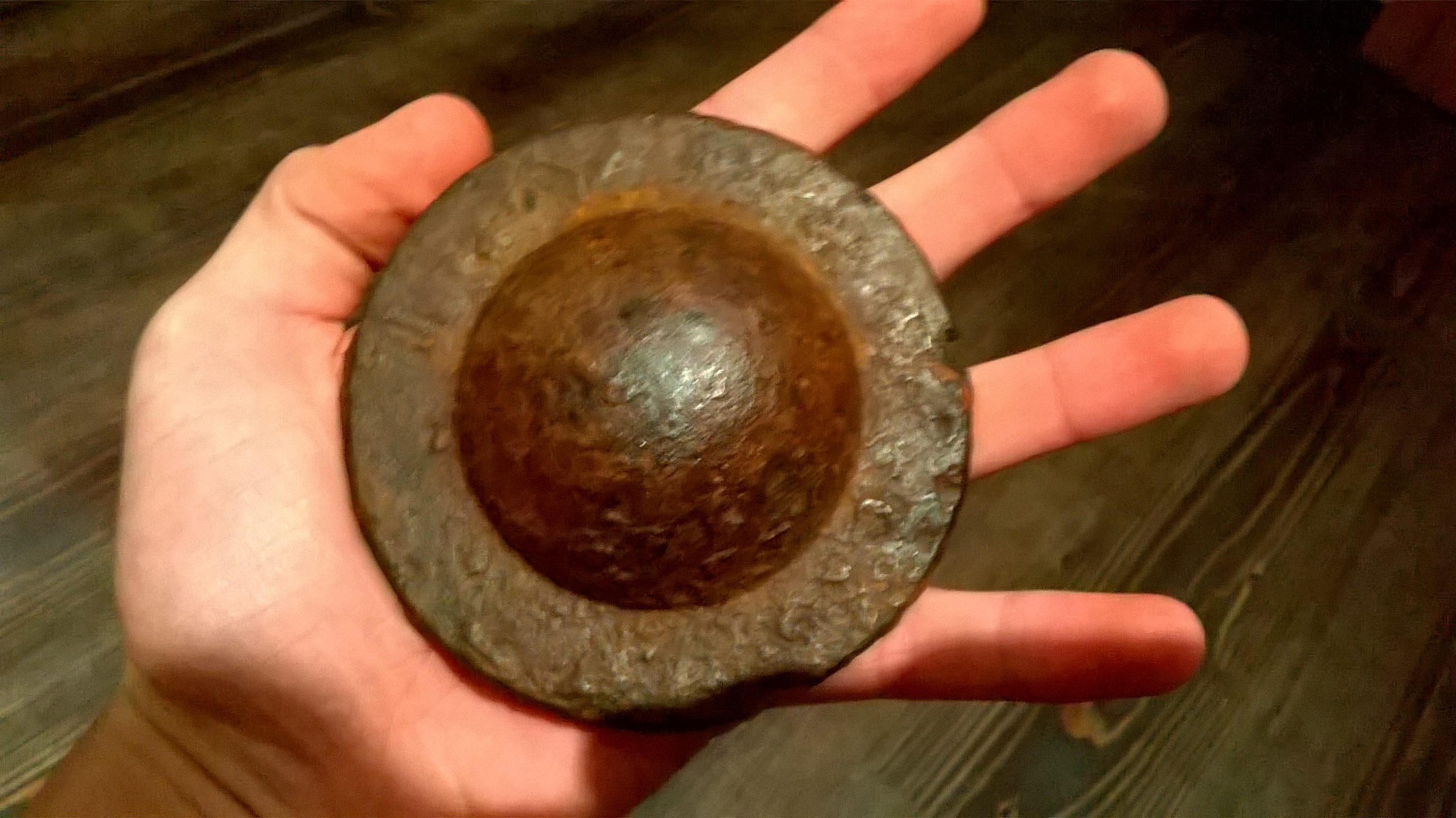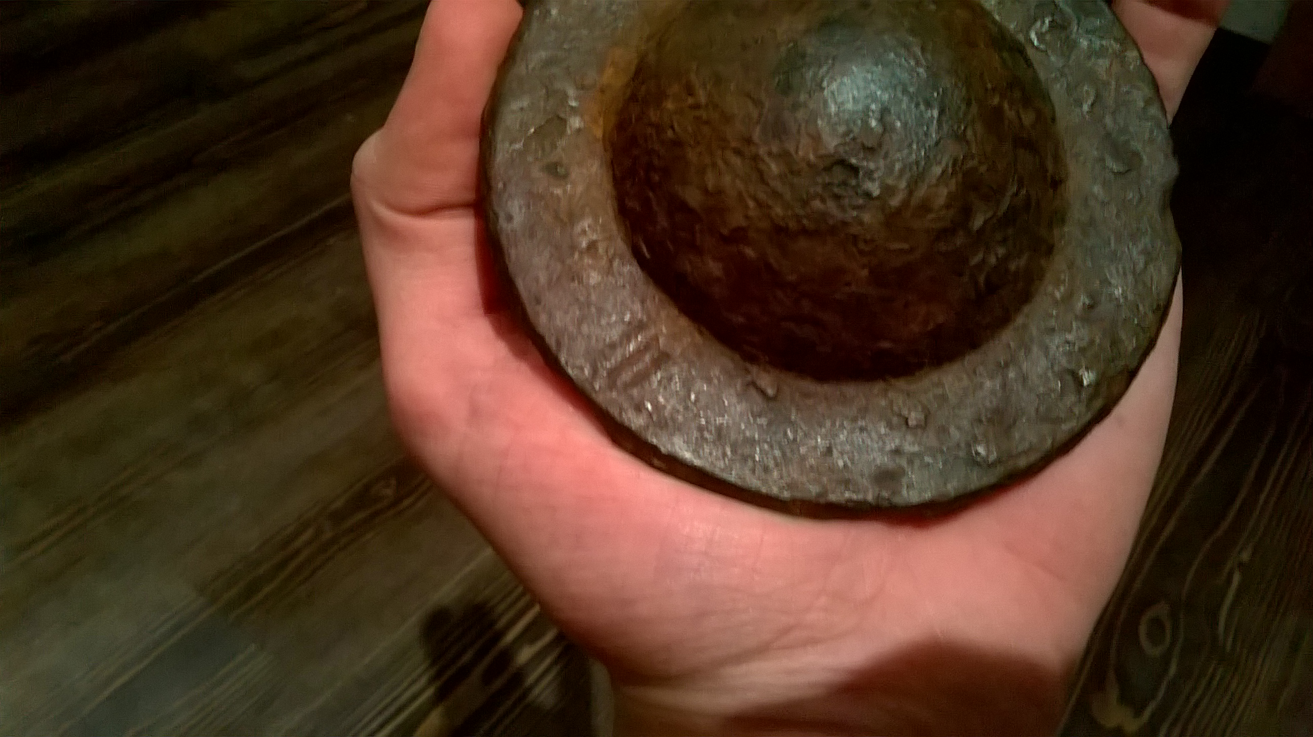 Hab dieses Objekt gefunden.....dachte erst an ein Schildbuckel, und mir fallen auch keine andren Optionen dazu ein, aber die Buckel die ich bisher gesehn hab hatten alle Löcher um sie ans Schild zu nageln.Ist es trotzdem ein Schildbuckel?Vielleicht habt ihr ja noch andre Ideen was es sonst sein könnte :gruebel: