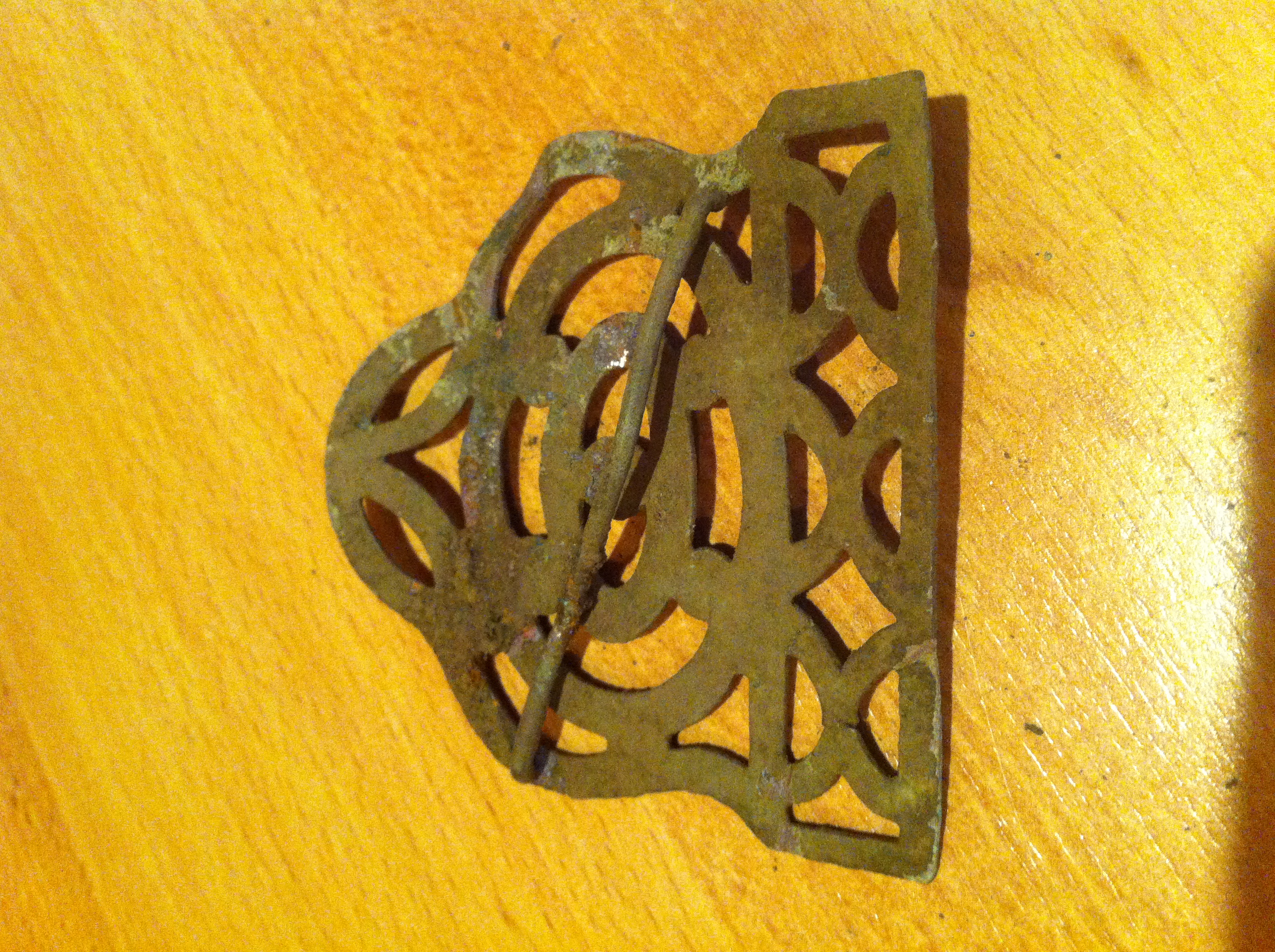 Der aufgelötete Steg war ursprünglich waagerecht. Ich gehe mal davon aus, dass das Teil irgendwo befestigt gehört. Dachte schon an Schulterklappen, aber dafür ist das Material wohl nicht stabil genug.