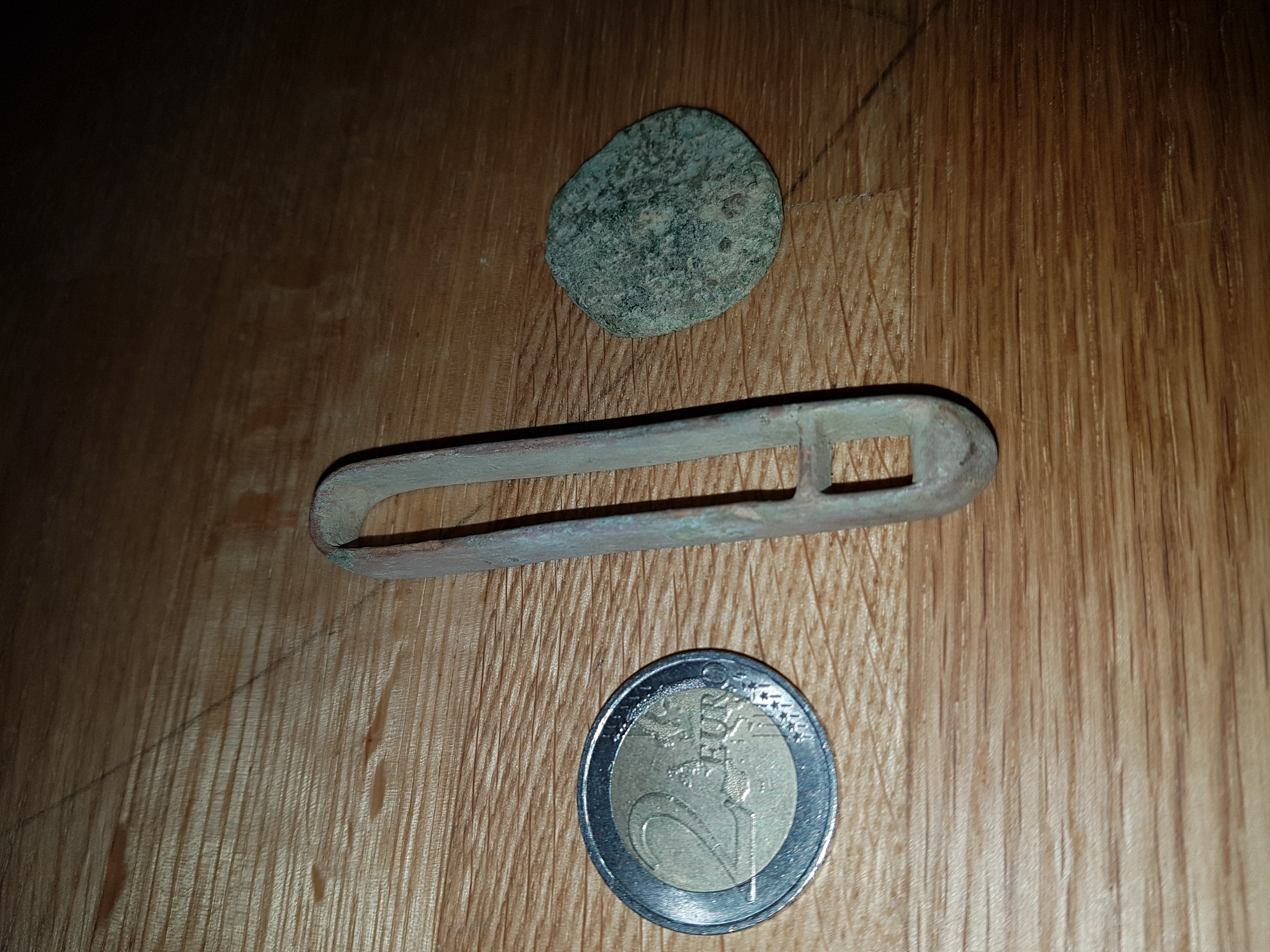 Das längliche Teil weiß ich nicht. Aber die Münze könnte durchaus römisch sein . Vielleicht mal bisschen mit Wasser feucht machen und mal in verschiedenen Lichteinflüssen drauf schauen. Vielleicht sieht man dann noch was