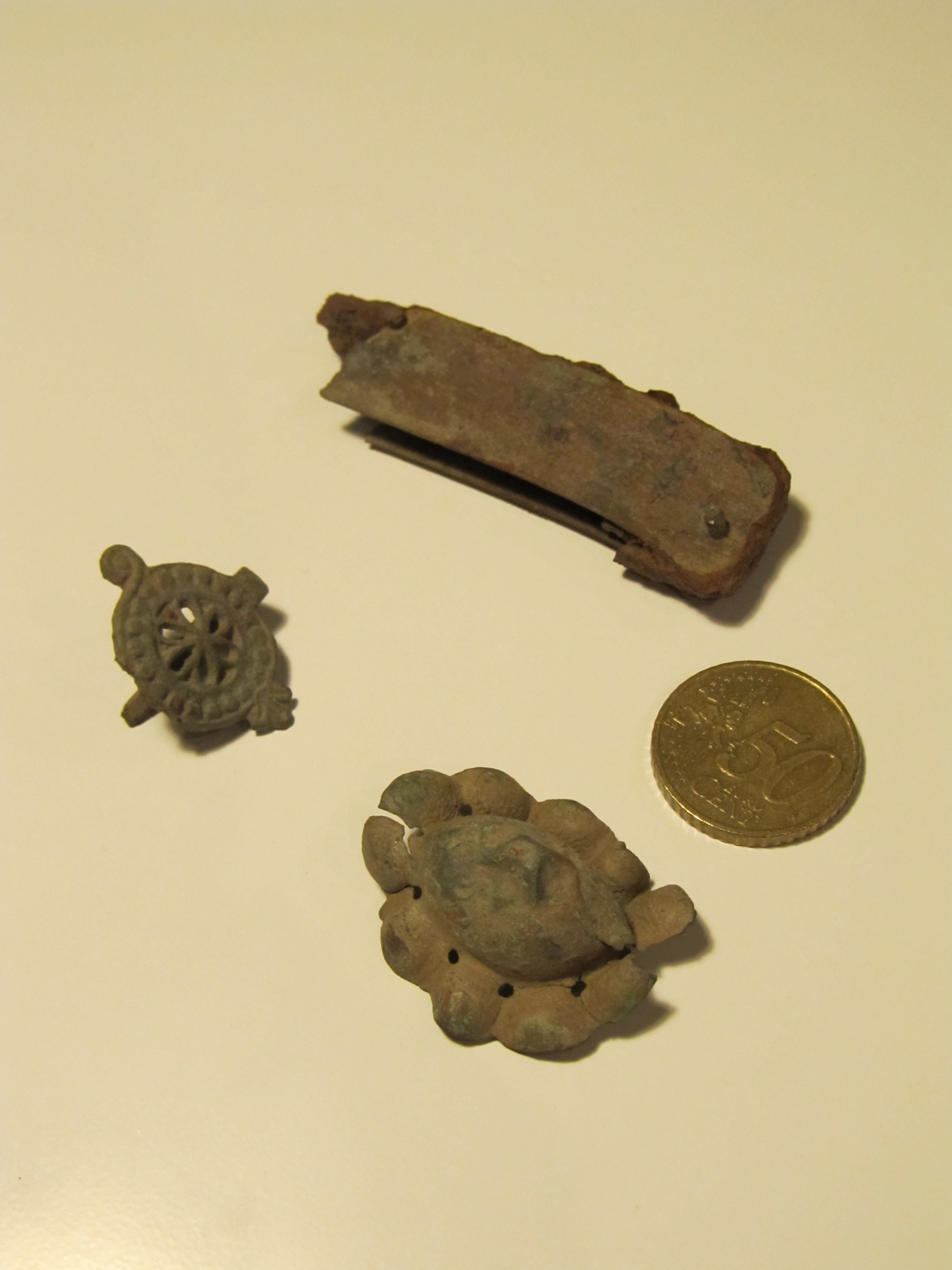ich habe mir jetzt auch eine Sonde zugelegt und dabei folgende Funde gemacht. Auf dem runden Objekt unten ist ein Hakenkreuz zu erkennen und evtl. eine Aufschrift die ich aber leider nicht entziffern kann. Das Objekt daneben könnte eine Anstecknadel sein. Habe aber im Netz leider nichts dazu gefunden. Hat vielleicht jemand von euch eine Idee?