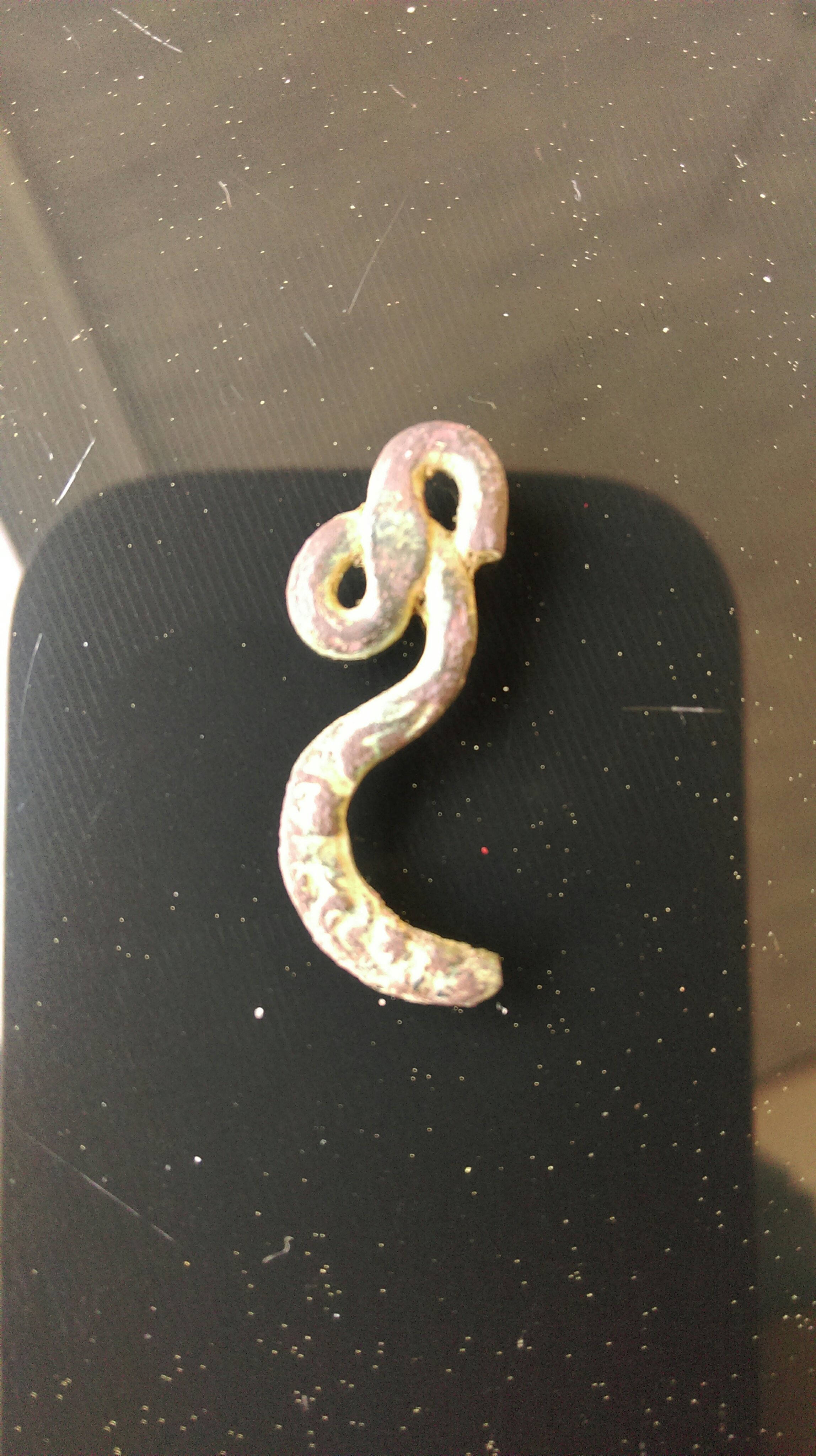 Habe gestern beim sondeln dieses merkwürdige Teil aus Bronze gefunden. Zuerst dachte ich an Stück Draht, aber beim genaueren hinschauen sah ich Verzierungen im unteren Bereich.