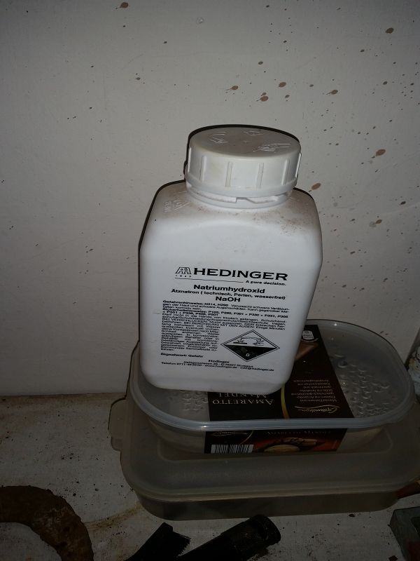 Sobald das dest. Wasser mit dem Natriumhydroxid angefertig ist, lege ich das vom Rost befreite Fundstück rein.